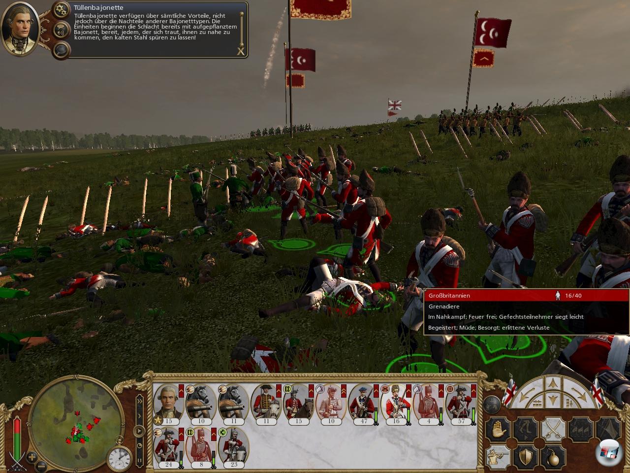 Auch so sorgt die schiere Vielfalt der Waffengattungen für enorme taktische Möglichkeiten – es gibt alle Arten von Truppen, alle Arten von Distanzen: Da sind klassische Nahkämpfer bei den Indianern, die mit Äxten und Kriegsgebrüll voran stürmen, und sobald die Infantrie die Bajonette aufpflanzt oder die Reiterei zu Säbeln und die Ulanen sogar noch zu Lanzen greifen, weht fast wieder ein mittelalterlicher Wind. Kann man dreihundert Indianer mit 80 britischen Coldstream Guards aufhalten? Ja, aber man fiebert jeder Salve dieser Elite-Einheit hinterher. Aber kann man dreihundert irokesischen Bogenschützen mit diesen Männern Stand halten? Nein, denn sie haben einfach mehr Reichweite – undzwar 20 mehr als normale Schützen. Gerade diese mittlere Distanz der zahlreichen Jäger, Musketen- und Scharfschützen sowie Grenadiere, die ihre runden Granaten wie Chinaböller in die feindlichen Reihen werfen, sorgt für eine neue, überaus spannende Dimension der Entfernungen.