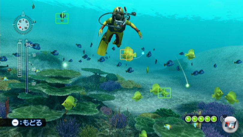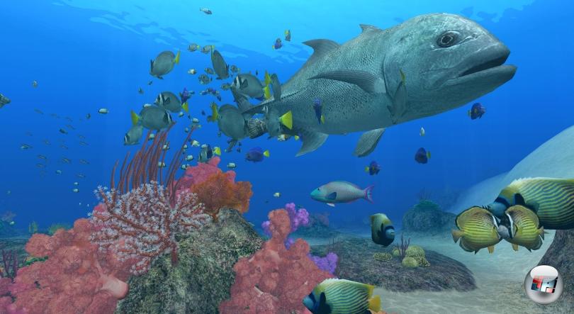 Mal mit einem gehörigen Aha-Effekt auftrumpfen: Nach einer kurzen Abtauchsequenz befinde ich mich zehn Meter unter Wasser und bestaune exotische Fischarten und Korallengärten in einer erstaunlich hübschen Kulisse. Eindrucksvoll bricht sich das einstrahlende Sonnenlicht auf dem Grund und den zahlreichen Objekten im Wasser. Das Ganze wird begleitet vom charakteristischen und akustisch einwandfrei umgesetzten Ein- und Abblasgeräusch des Lungenautomaten sowie einem angenehm ruhigen orchestralen Soundtrack. Der erste audiovisuelle Eindruck ist also prima. Ich schaue mich etwas um, während mir Oceane die grundlegenden Steuerungsfunktionen erläutert. So zeige ich mit der Wii-Mote in die Richtung, in die ich schwimmen möchte und führe mit dem B-Knopf Flossenschläge aus. Mit dem A-Knopf fokussiere ich auf einzelne Fische, Pflanzen oder Objekte und erfahre interessante Details über die Spezies. So erweitere ich die spielinterne Datenbank, die zunächst leer ist. Später aktiviere ich genauso auch bestimme Instrumente und Geräte. Es steht mir übrigens frei ob ich per Egosicht oder via leicht hinter meiner Spielfigur versetzter Kamera tauchen möchte.