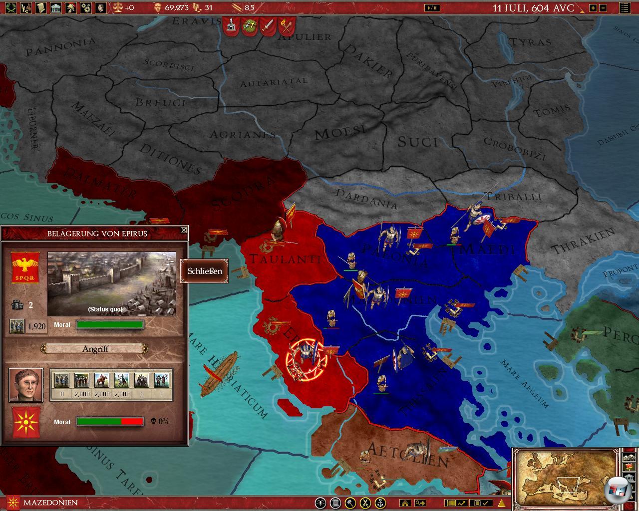 Diese kurze Zeit müsst ihr nutzen, um Griechenland notfalls mit dem Schwert zu einen. Diplomatie ist ein Weg, um Mitstreiter zu finden. Obwohl ihr dieses Mal Gesandte schickt, funktioniert das ähnlich wie in EU 3. Die kleinen Mächte hassen Rom ohnehin, so dass es keine große Sache ist, sie zu überreden. Einige fragen sogar von sich aus nach Bündnissen. Eure zweite Armee aus Plänklern, schwerer Infanterie, Reitern und Bogenschützen schickt ihr dorthin, wo Verbündete Roms sind. Ihre Miniarmeen sind schnell besiegt, dann müsst ihr allerdings die Städte belagern, um sie euch einzuverleiben, was wertvolle Zeit kostet. Die Belagerung läuft zwar automatisch, aber den Zeitpunkt zum Sturm müsst ihr bestimmen. Wenn der nicht stimmt, beißen sich eure Mannen die Zähne aus. Oder ihr wartet darauf, dass sich die Stadt von selbst ergibt. Erst als die Römer mit vielen Legionen landen, wird’s brenzlig.