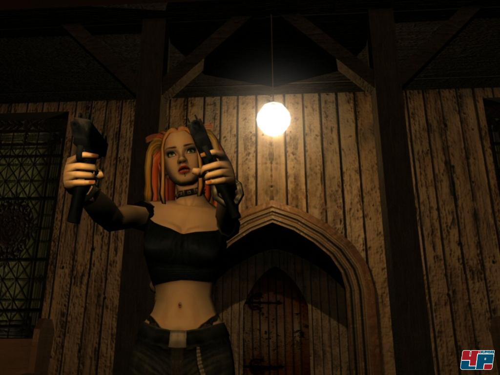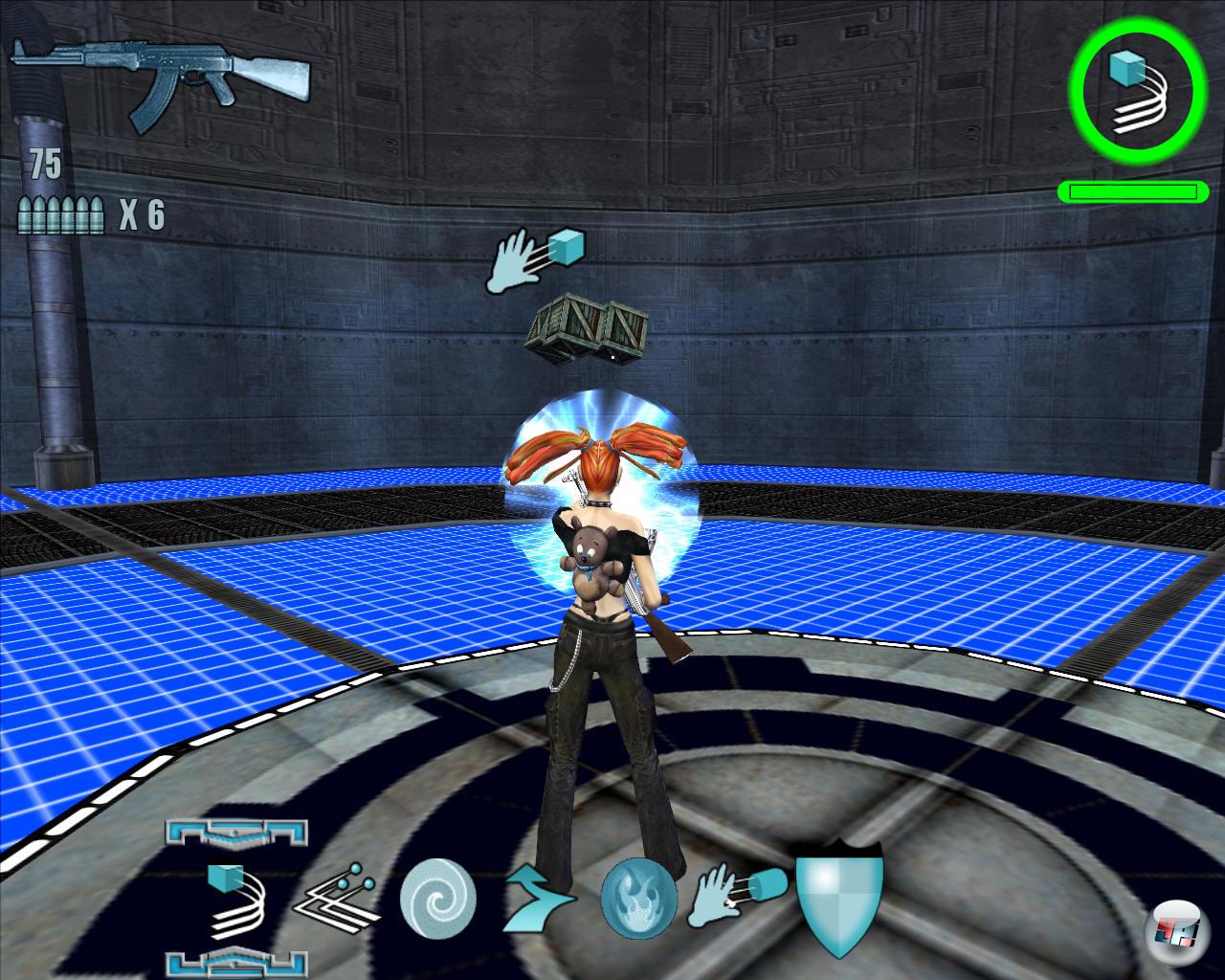 denn ich spreche eine andere Sprache als die Entwickler: »Sperren Sie Voller Schirmanti-Aliasing« – öhm, okay. »Ermöglichen Sie Umgebender Heller Ausgleich Steuerung« – ja, aber keine Zwiebeln, dafür bitte mehr Tomaten. »Sperren Sie Stichhaltiges System« – ist schon geschehen. Denke ich zumindest. Ich hoffe, ich habe jetzt nicht gerade mein Erstgeborenes verkauft. »Beginnen Sie Spiel« – das kenne ich, das nehme ich! Lange Ladezeit. Niedrig aufgelöste Entwickler- und Publisherlogos. Hauptmenü, Spieleinstellungen. Ich versuche, die furchtbar definiert klingenden Tasten umzubelegen, das geht aber nicht – die Möglichkeit wird mir zwar angeboten, die Änderung aber nicht übernommen. Na schön, dann eben nicht, wird auch so gehen. Spielstart. Vier Schwierigkeitsgrade, zwei Spielmodi (Abenteuer, Zeit-Herausforderung), drei Personalisierungen – die Heldin darf ihren Schwerpunkt auf »Scharfschütze«, »Tarnen« und »Aggression« legen. Ich habe noch keinen Kaffee intus, wähle also »Aggression«. Lange Ladezeit. 4/4-Drums setzen ein, Bild zeigt Supermodel mit zappelndem Teddy auf dem Rücken, aus der Hose herauswachsendem Tanga und Strubbelzöpfen. Warum der Teddy? Keine Ahnung, Supermodels mit aus der Hose herauswachsendem Tanga und Strubbelzöpfen tragen das wohl heutzutage. ![]()