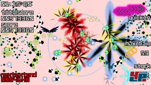 Immerhin kein gewöhnliches, sondern eines mit einer wirklich innovativen Spielidee. Die setzt sich zur Abwechslung nicht mit dem Verschieben von Steinchen auseinander, stattdessen sprengt ihr euch kurzerhand selbst in die Luft. Bevor uns jetzt eine Welle von Protestbriefen erreicht: Nein, das Spiel ist kein Training für Selbstmordattentäter. Es spielt in einer abstrakten Welt und lässt sich eher mit einem bunten Feuerwerk vergleichen, das man mit einem gelben Zielkreuz zündet. Ihr steuert also euren gelben Cursor, während aus allen Himmelsrichtungen Fantasieobjekte auf euch zufliegen. Euer Ziel ist es nun, so viele dieser Gegner wie möglich mit eurer Explosion zu treffen. Besonders sinnvoll ist es, zu warten, bis mehrere Objekte sich möglichst nah nebeneinander befinden. Zündet ihr dann die Bombe, löst ihr eine regelrechte Kettenreaktion aus: Ein Feind nach dem anderen sprengt mit seiner Explosion seinen Nachbarn in die Luft und taucht den Screen in ein buntes Farbenmeer. Im Idealfall habt ihr zum Schluss die gesamte Bildfläche von Gegnern gesäubert. Mit Hilfe solcher Massenexplosionen besiegt ihr auch größere Zwischen- und Endgegner, die euch wie in einem Shoot ‚em up mit einem Kugelhagel eindecken. Dank der großzügigen Kollisionsabfrage schlängelt ihr euch auch in solch hektischen Situationen souverän durch die kleinsten Lücken.