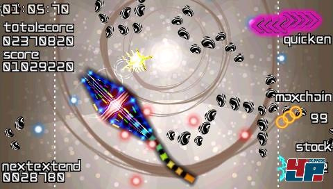 Rund drei Jahre gibt es Q Entertaiment mittlerweile. Gründungsmitglied Tetsuya Mitsuguchi kündigte bei Sega, um als freier Entwickler kreative Spielideen umzusetzen zu können. Dabei herausgekommen sind bisher hautpsächlich Knobelspiele wie Meteos <A class=DYNLINK onmouseover="DynToolTipp_Show('Klicken für Gameinfos‚)“ onmouseout=“DynToolTipp_Hide(); “ href=“javascript:DynCont_Display(‚Gamefinder‘,’runmod.php?sid={SID}&LAYOUT=dyncont_gf&spielid=7848′)“> für den DS und Lumines <A class=DYNLINK onmouseover="DynToolTipp_Show('Klicken für Gameinfos‚)“ onmouseout=“DynToolTipp_Hide(); “ href=“javascript:DynCont_Display(‚Gamefinder‘,’runmod.php?sid={SID}&LAYOUT=dyncont_gf&spielid=7079′)“> für die PSP. Auch Every Extend Extra <A class=DYNLINK onmouseover="DynToolTipp_Show('Klicken für Gameinfos‚)“ onmouseout=“DynToolTipp_Hide(); “ href=“javascript:DynCont_Display(‚Gamefinder‘,’runmod.php?sid={SID}&LAYOUT=dyncont_gf&spielid=8572′)“> (EEE) für Sonys Handheld fällt in diese Kategorie. Dabei wünsche ich mir doch so sehnlich einen Nachfolger für das audiovisuelle Meisterwerk Rez <A class=DYNLINK onmouseover="DynToolTipp_Show('Klicken für Gameinfos‚)“ onmouseout=“DynToolTipp_Hide(); “ href=“javascript:DynCont_Display(‚Gamefinder‘,’runmod.php?sid={SID}&LAYOUT=dyncont_gf&spielid=2206′)“>. Doch das Leben ist kein Wunschkonzert und EEE eben kein dreidimensionaler Rail-Shooter, sondern ein Puzzlespiel.