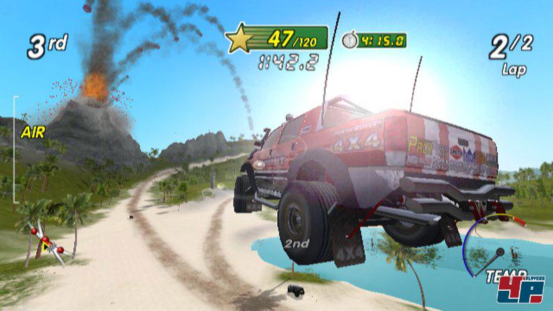 Ja, ihr habt richtig gelesen: Bei Excite Truck geht es nur in zweiter Linie darum, als Erster die Ziellinie zu überqueren. Wichtiger sind die Punkte, die ihr in Form von Sternen für besondere Leistungen erreichen könnt. Das kann z.B. ein extrem lang gezogener Drift sein, eine Karambolage mit einem der konkurrierenden KI-Trucks oder auch ein exorbitanter Sprung, der euch nicht nur für die so genannten „Hang Time“, sondern unter bestimmten Voraussetzungen auch für das Durchfliegen von Ringen belohnt.