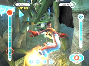 der Kamera. Hat sie sich auf euren Kopf eingeschossen, fungiert ihr nur noch als Bewegungsgeber, der sein digitales Alter Ego auf dem Bildschirm steuert. Ihr spielt einen von acht Hoverboard-Fahrern, mit dem ihr futuristische Strecken abrast!