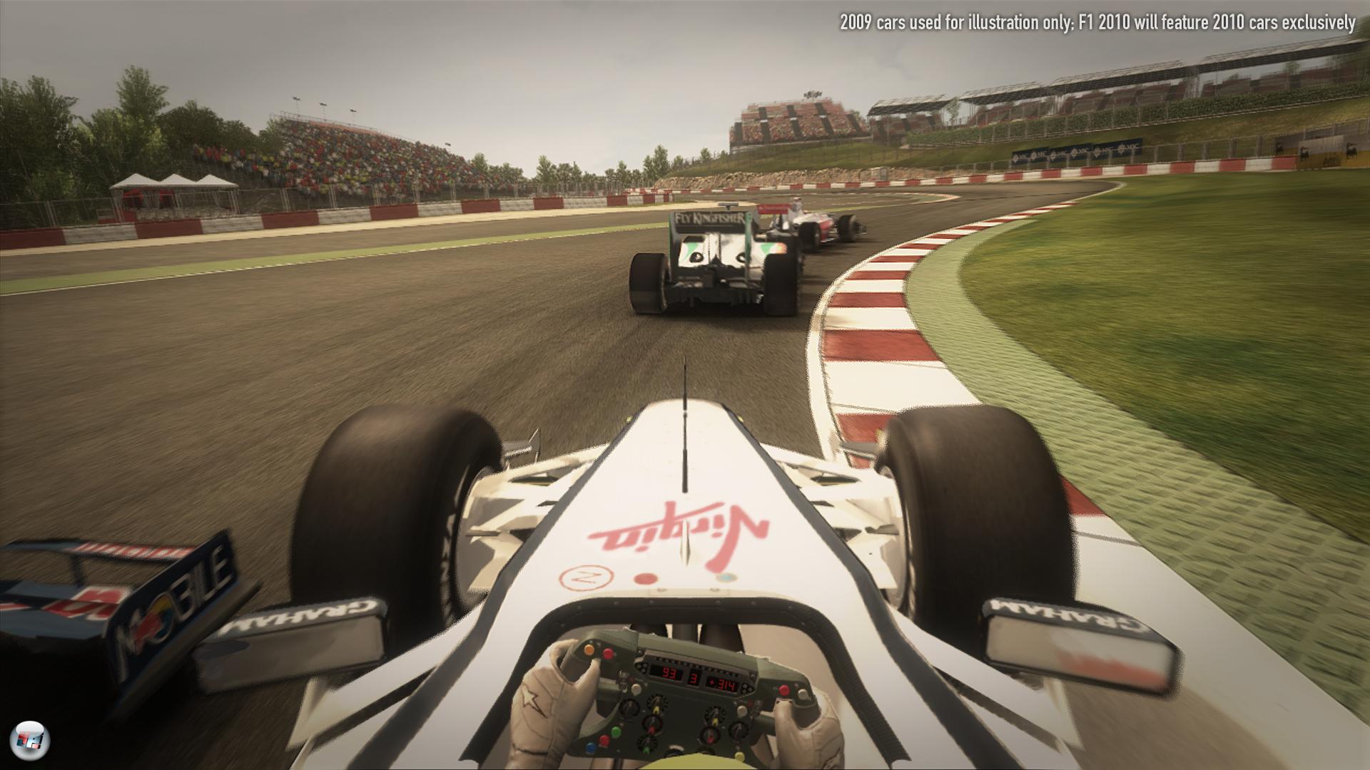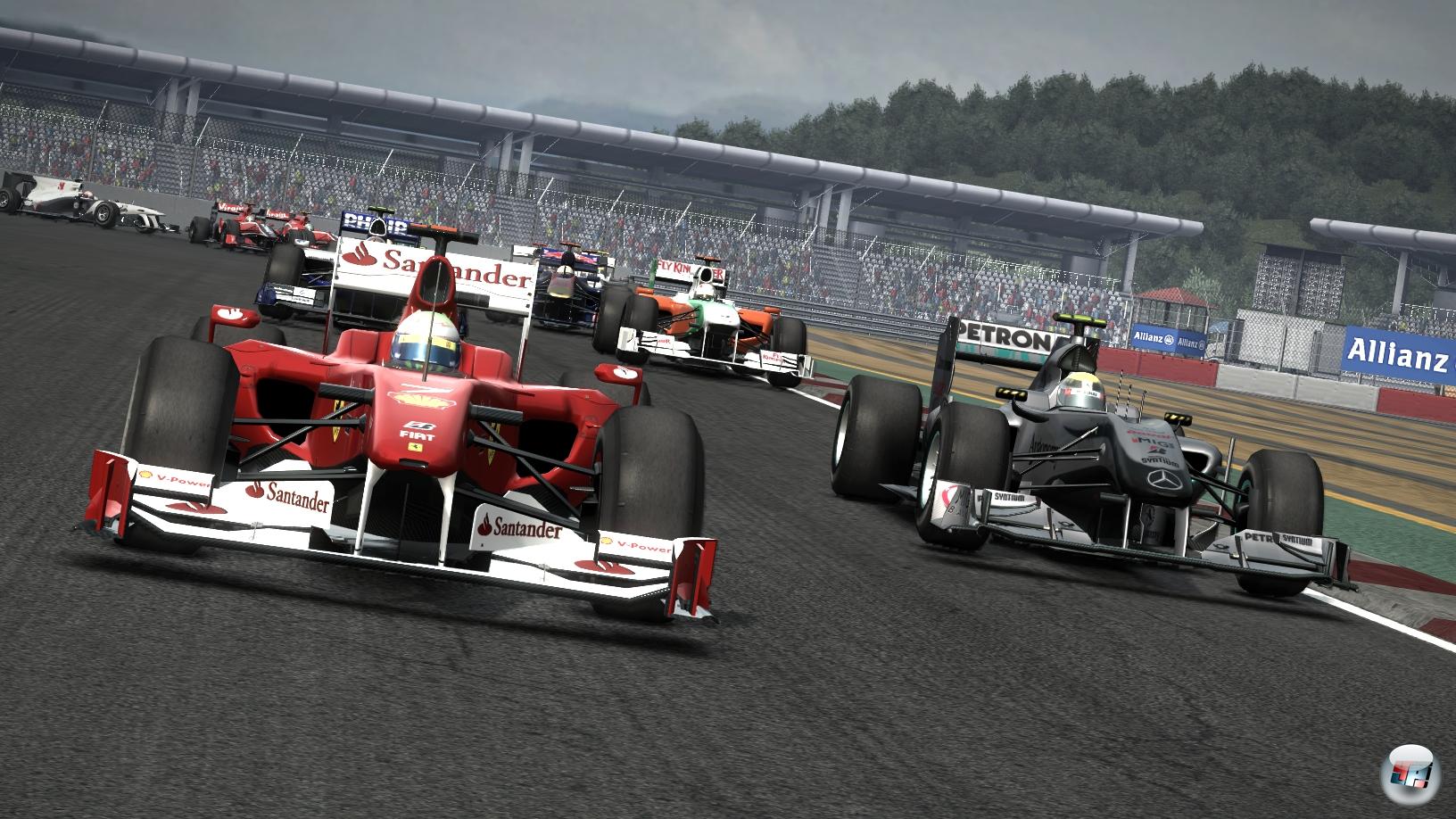 Für die Fahrphysik gilt das zum Glück nicht: Schaltet man Hilfen wie ABS oder die Traktionskontrolle ab und entscheidet sich für ein volles Schadensmodell inklusive Reifenverschleiß sowie Benzinverbrauch, bekommt man vor allem bei Regenwetter eine durchaus anspruchsvolle Herausforderung, bei der man viel Feingefühl im Umgang mit Gas und Bremse beweisen muss. Klar, bei einer Hardcore-Simulation kann F1 2010 nicht mithalten, denn dafür reagieren die Boliden oft noch zu gutmütig. Trotzdem tendiert Codemasters hier deutlich mehr zum Realismus als noch bei Race Driver: Grid oder der Dirt-Serie – eine gute Entscheidung. Dieser Anspruch wird zusätzlich dadurch unterstrichen, dass man auf den Gummiband-Effekt verzichtet: Hier erlebt man keine Konkurrenten, die plötzlich schneller fahren, sobald man in Führung liegt oder den Fuß vom Gaspedal nehmen, wenn man den Anschluss verliert. So muss man gerade in höheren Schwierigkeitsgraden eine konstant gute Leistung zeigen, wenn man auf das Podest rasen will. Der Reifenverschleiß wurde ebenfalls gut umgesetzt: Neben dem Unterschied zwischen weichen und harten Mischungen spürt man auch, wie die Haftung mit zunehmender Renndauer immer mehr abnimmt. Selbst der Verschleiß der insgesamt acht Motoren pro Saison wirkt sich auf die Performance aus und auch die Benzinmenge spielt eine Rolle. Allerdings wird man nie mit einem leeren Tank auf der Strecke liegenbleiben – stattdessen wird die Leistung auf ein Minimum reduziert, mit dem man sich aber zumindest noch bis an die Box schleppen kann. Auf mechanische Ausfällt wird dagegen leider komplett verzichtet – und das sowohl beim Spieler als auch den KI-Piloten. Zumindest optional wären Ausfälle genau so wünschenswert wie ein Safety-Car, das ebenfalls nicht integriert wurde. Die dynamischen Veränderungen der Strecke sind dagegen gelungen, denn bei nachlassendem Regen trocknet nicht nur die Ideallinie schneller ab, sondern im Laufe eines Wochenendes nimmt auch der Grip durch den Gummiabrieb auf dem Asphalt immer mehr zu.