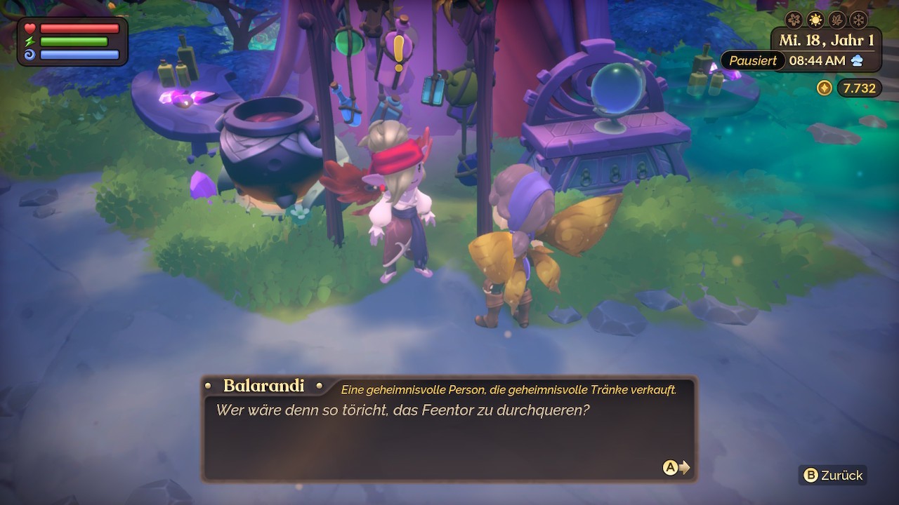 Zehn Fertigkeiten begleiten mein Gameplay: Rohstoffabbau, Abholzen, Feldarbeit, Angeln, Sammeln, Tierchen (Insekten) fangen, Tierpflege, Kochen, Tränke brauen und Magie. Alle davon steigen nach und nach im Level auf, die maximale Stufe beträgt 20. Um mehr Geld zu verdienen, versuche ich, möglichst seltene Fische und Insekten fangen und diese dann weiterzuverarbeiten, wodurch sie mir auf dem Markttisch mehr Gold einbringen.