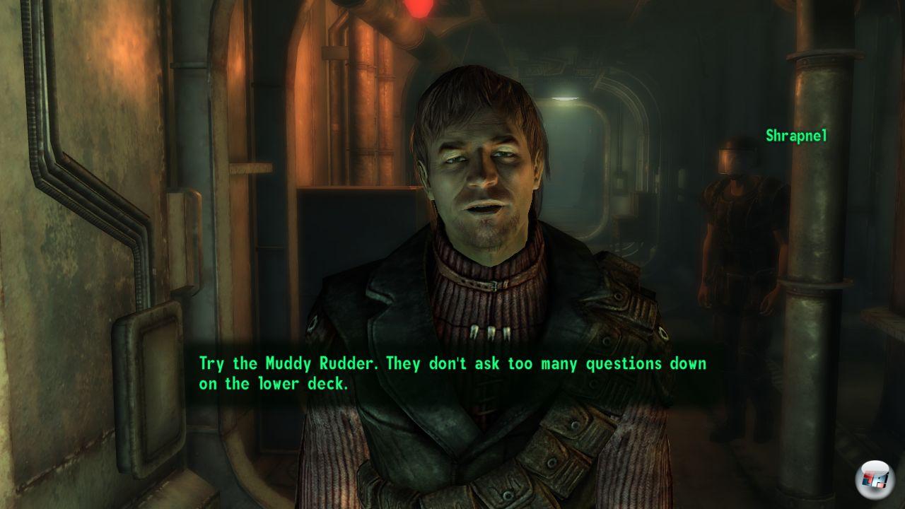 Falls ihr wollt, könnt ihr euch auf die Vatersuche begeben und Antworten finden – und das kann ich nur empfehlen, denn dieser Erzählstrang ist straff und spannend. Zwar wird man an der Angel der Neugier immer weiter zu den Spuren des Vaters geführt, muss für jeden Hinweis eines Augenzeugen wieder neue Aufgaben und Gefälligkeiten leisten, aber die Suche wird von einer Story belohnt, die einen irgendwann nicht mehr loslässt. Das liegt zum einen daran, dass sie kommentiert wird: Ähnlich wie in Grand Theft Auto IV <a class="DYNLINK" onmouseover="DynToolTipp_Show('Klicken für Gameinfos‚)“ onmouseout=“DynToolTipp_Hide(); “ href=“javascript:DynCont_Display(‚Gamefinder‘,’runmod.php?sid=%7BSID%7D&LAYOUT=dyncont_gf&spielid=9777′)“> kann man Radiosender laufen lassen. Entweder den patriotischen Rundfunk der „Enklave“, wo sich ein erzkonservativer Präsident „Eden“ an die letzten rechtschaffenen Amerikaner richtet. Oder „Galaxy News“, wo sich ein cooler Rebell namens „Three Dog“ für die Wahrheit einsetzt und euren Vater getroffen hat.
