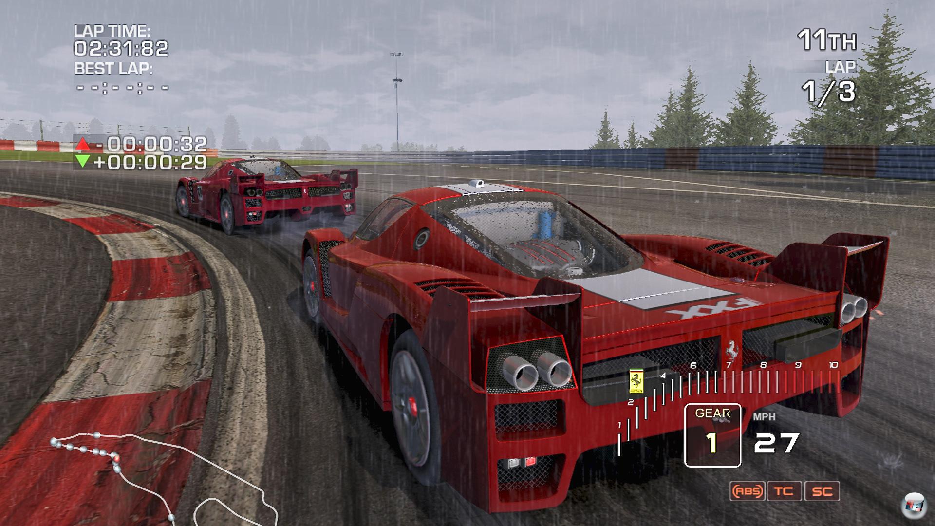 Die Fahrphysik von Ferrari Challenge erinnert mehr an eine Simulation, auch wenn der Detailgrad eines rFactor oder GTR nicht erreicht wird, obwohl Rennfahrer Bruno Senna am Feintuning der Fahrphysik mitgewirkt hat. Schaltet ihr die Fahrhilfen ABS, Traktionskontrolle und Stabilitätskontrolle hinzu, die sich in mehreren Stufen regeln lassen, habt ihr die aggressiven PS-Monster sicher im Griff – allerdings büßt ihr gerade durch die Traktionskontrolle (zu) viel Geschwindigkeit beim Herausbeschleunigen aus den Kurven ein. Echte Profis verzichten sowieso auf jegliche elektronische Unterstützung, wodurch das Handling deutlich anspruchsvoller wird und die Boliden schnell ins Schlingern kommen. Spielt ihr mit dem Controller, stößt allerdings das automatische Gegenlenken beim Rutschen sauer auf, das euch selbst dann noch unter die Arme greift, wenn ihr sämtliche Fahrhilfen deaktiviert habt. Besonders ärgerlich ist es auch deshalb, weil ihr dadurch in Kurven stellenweise gar nicht so stark einlenken könnt, wie es nötig wäre und deshalb im Kiesbett landet. Was soll das?! Erst wenn ihr ein Lenkrad anschließt, dürft ihr endlich vollkommen manuell das ausbrechende Heck mit Lenkbewegungen korrigieren und freut euch zudem auf ein hervorragendes Force Feedback, dessen Intensität aber nirgends eingestellt werden kann. Überhaupt geben sich die Entwickler von Eutechnyx diesbezüglich sehr sparsam: Am Wheel dürft ihr lediglich die Sensibilität des Lenkrads sowie der Pedale separat in drei Stufen regeln. Detaillierte Anpassungen wie z.B. die der Dead Zone oder des maximalen Bewegungsradius, sind nicht möglich – das Gleiche gilt für Umbelegungen der Funktionen. So hatte ich beim Spielen mit dem Driving Force Pro öfters das Problem, beim Lenken das Digitalkreuz berührt zu haben, was die Fahrhilfen aktiviert, was wiederum am Ende weniger Preisgeld bedeutet. Doch noch schlimmer erwischt es Pad-Piloten, denn hier habt ihr keinerlei Möglichkeiten, die Steuerung auf eure persönlichen Vorlieben anzupassen. Dabei wären gerade das