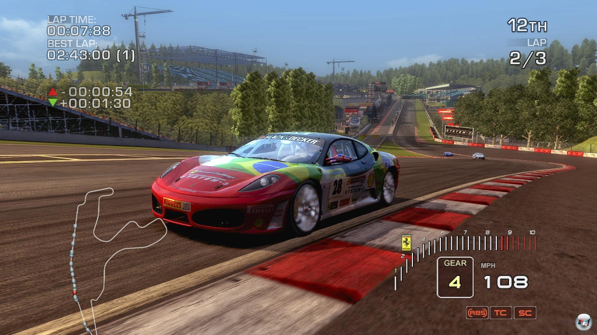 Für ein Rennspiel kann es eigentlich nichts Schlimmeres geben als eine Grafikengine, bei der das Geschehen ins Stocken kommt und so dem Geschwindigkeitsgefühl einen herben Dämpfer versetzt. Bei Ferrari Challenge ist leider genau das in regelmäßigen Abständen der Fall – gerade in Kurven geht die Framerate, die ohnehin nicht mehr als 30 Bilder pro Sekunde schafft, gerne mal in die Knie, selbst wenn weit und breit kein anderes Fahrzeug auf dem Bildschirm zu sehen ist. Besonders angesichts der langen Entwicklungszeit und den ständigen Verschiebungen frage ich mich, warum gerade hier nicht alles daran gesetzt wurde, diesen Bereich zu optimieren. Davon abgesehen wirken die Kulissen trotz einiger netter Details wie aufgewirbeltem Laub auf mich übertrieben bunt und werden teilweise von fiesen Pop-Ups geplagt. Vor allem auf langen Geraden wie in Spa oder Maranello seht ihr selbst mitten im Fahrstress, wie der Hintergrund plötzlich aufgebaut wird. Erfreulich ist aber, dass sich das übliche Kantenproblem der PS3 hier in Grenzen hält – auch wenn es hier und da mal etwas flimmert – und sich auch die Partikeleffekte durchaus sehen lassen können. Auch die Replays sind im Prinzip mit den tollen Schnitten und Perspektiven absolut sehenswert, bieten aber leider viel zu wenig, ach quatsch, keinerlei Optionen. Ihr dürft weder spulen, noch Ansichten und Fahrer auf Knopfdruck durchschalten oder die schicken Filmchen abspeichern – auch von einem Foto-Modus fehlt jede Spur, obwohl die Ferraris zu den schönsten Motiven zählen dürften, die man in der Autowelt finden kann.