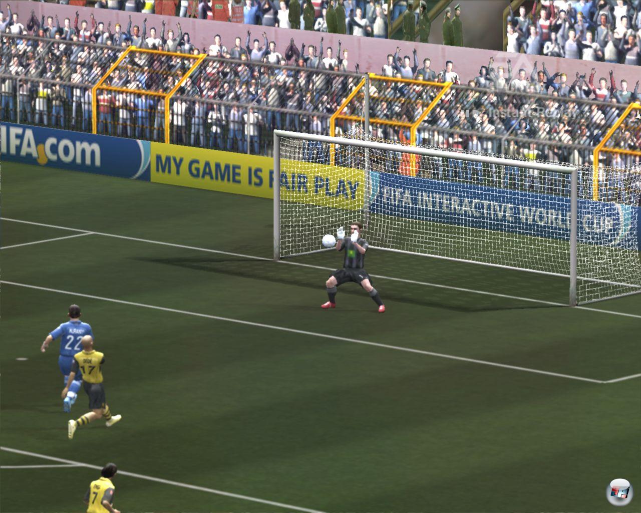 | Auch wenn der Torwart hier vorbildlich hält: Die Aussetzer beim Abwurf stören genau so wie die Fehler im defensiven Stellungsspiel. (PC) |