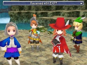 Fans von typisch japanischen Knuddelaugen-auf-großen-Köpfen-Helden werden diesen Seufzer übrigens noch weitaus öfter ausstoßen: Die niedlichen, puppenhaften Figuren sind putzig designt und ebenso animiert, alles ist irgendwie knuddelig – seit den Dreipixelhochs der NES-Zeit hat sich nachweislich einiges getan! Das ganze Spiel ist jetzt komplett in 3D; jeder Dungeon, jedes Monster besteht aus texturierten Polygonen, die flott über die beiden Bildschirme geschaufelt werden: Tummelt ihr euch auf der Landkarte, lauft, schwimmt, fliegt oder Chocobo-reitet ihr auf dem unteren Screen, während oben eine Übersichtskarte die bereits entdeckten Ortschaften abbildet. Innerhalb von Dungeons oder Städten bleibt der obere Schirm schwarz, bis man das Menü aufruft, das dann nach unten rückt. Alles stilvoll, alles schön – und bei Kämpfen von ansehnlichen Effekten umrahmt.