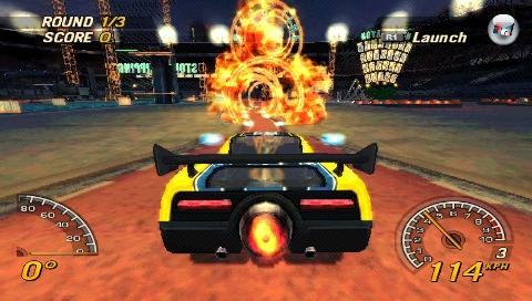 Spielerisch gleicht Head On also FlatOut 2 wie ein Dummy dem anderen – und technisch? Systembedingte Grafikabzüge (matschige Texturen, weniger Effekte, gröbere 3D-Modelle, weniger Streckendetails) jetzt mal ausgenommen schlägt sich der Titel im Vergleich zu Need for Speed und Konsorten mehr als kompetent: Die zerlegbaren Strecken zischen rasant an den schön schrottigen Karren vorbei, das Schadensmodell ist ausgefeilt, die Physikengine vermittelt ein glaubwürdiges, schweres und mächtiges Bolidengefühl. Allerdings hat das Spiel auf der PSP einen großen Nachteil: Da war jemand bei der Grafikkonvertierung ganz schön faul! FlatOut 2 war ursprünglich ein 4:3-Spiel, bei der Umsetzung auf die 16:9-PSP wurden Anzeigen, Menüs und Zwischenbilder aber nicht perspektivisch korrekt übertragen. Resultat: Alles, was nicht direkt Spielegrafik ist, wirkt ziemlich gestreckt. Das ist natürlich kein Achsenbruch, sieht aber einfach nicht schön aus.