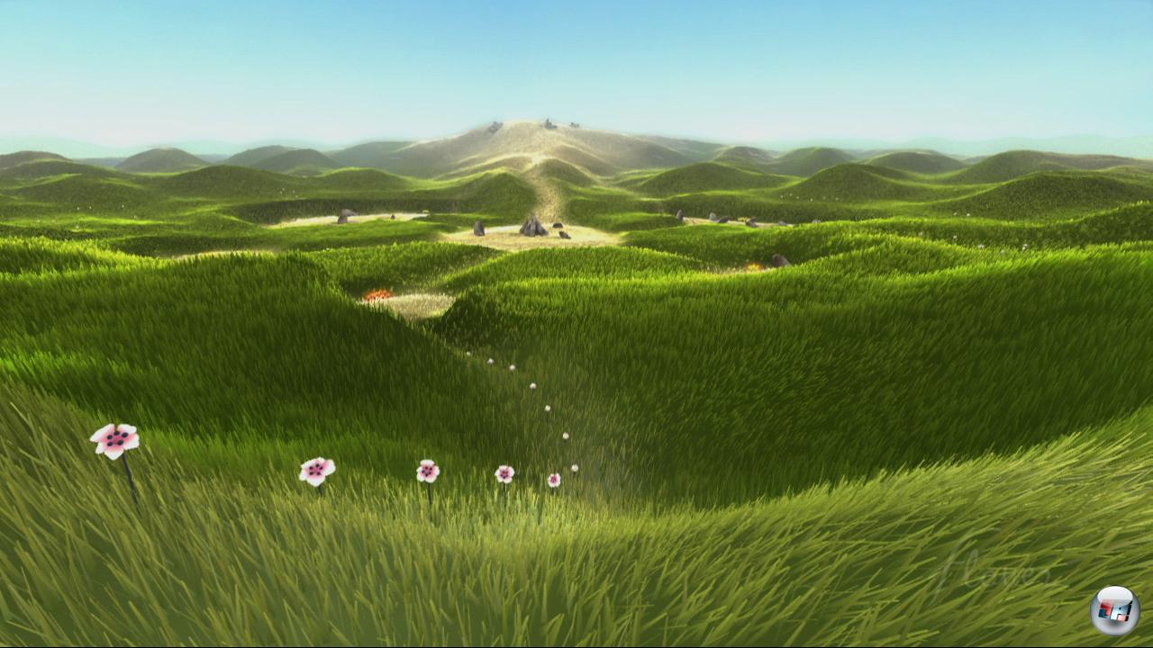 Ja. Stimmt. Aber irgendwie will mich dieses fliegende Erlebnis nicht loslassen. Und irgendwie steckt hier mehr drin als in flOw. Aber was genau? Schauen wir mal auf die Sixaxis-Steuerung: Als ich den Controller nach vorne neige, geht das kleine weiße Blatt zusammen mit all seinen blauen, gelben und cremefarbenen Nachzüglern in den Sturzflug. Kurze Zeit später küsst mein kunterbunter Schweif diese riesige Wiese, die sich wie ein Vorhang teilt – wow! Eine dermaßen glaubwürdig animierte Landschaft habe ich noch nicht gesehen.