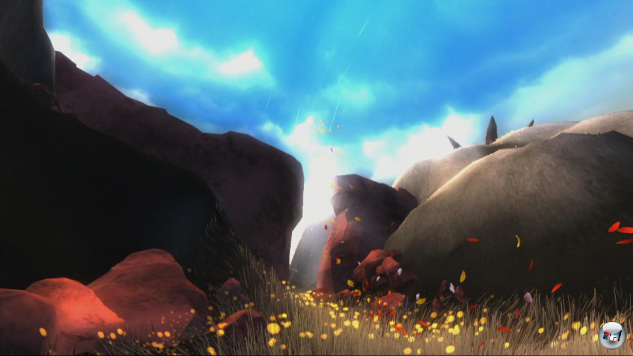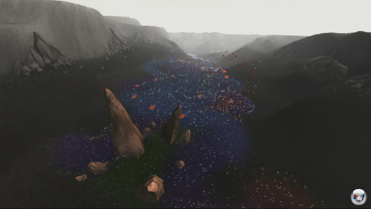 Ich drücke X und rase wie ein ICE durch das hohe Gras, während sich links und rechts hunderte Halme ehrfurchtsvoll verneigen. Hinzu kommt das akustische Feedback: Bei jedem Kontakt mit einer Blüte begleiten mich sanfte Klavieranschläge, die eine fortlaufende Melodie ergeben, wenn ich den Kurs halte – ja, zu Beginn wird man vor allem technisch beeindruckt. Gegen diese lebendige Flora mit ihren hunderttausenden gleichzeitigen Animationen von einzelnen (!) Stengeln, Blättern und Blüten wirken die Landschaften von The Elder Scrolls IV: Oblivion <a class="DYNLINK" onmouseover="DynToolTipp_Show('Klicken für Gameinfos‚)“ onmouseout=“DynToolTipp_Hide(); “ href=“javascript:DynCont_Display(‚Gamefinder‘,’runmod.php?sid=%7BSID%7D&LAYOUT=dyncont_gf&spielid=6001′)“>, Two Worlds <a class="DYNLINK" onmouseover="DynToolTipp_Show('Klicken für Gameinfos‚)“ onmouseout=“DynToolTipp_Hide(); “ href=“javascript:DynCont_Display(‚Gamefinder‘,’runmod.php?sid=%7BSID%7D&LAYOUT=dyncont_gf&spielid=9077′)“> & Co wie statische Wälder der Videospielsteinzeit.