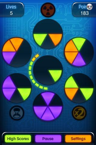 Allerdings heißt es „Game Over“ und eines der vier Leben ist futsch, wenn ein Tortenteil nicht sortiert werden kann oder alle sechs Kreise voll sind. Um das zu verhindern, muss man möglichst alle Kreise füllen, damit sie daraufhin geleert werden; außerdem bekommt man ein Extraleben oder eine Bonusfunktion, wenn man sie in einer Farbe füllt. Also heißt es möglichst: Orange zu Orange, Grün zu Grün etc. Das Knifflige daran ist die vorgegebene Position, denn man kann die Teile nicht mehr anders ausrichten. Ähnlich wie in Tetris geht es also darum, schnell und clever das Vorgegebene zu ordnen, damit zufällig auftauchende Bausteine verschwinden, bevor sie Schaden anrichten können. Hört sich einfach an?