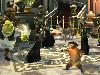 Von Anfang bis Ende des Spiels ist man zu viert unterwegs, wobei man immer nur eine Figur sieht – Shrek, Fiona, Esel und Kater stehen zur Auswahl. Zwischen allen darf man jederzeit auf Knopfdruck wechseln, was nicht nur optische Auswirkungen hat. Shrek kann brüllen, Kisten verschieben und Dinge tragen. Fiona kann mit ihren Ohren trompeten und mit ihrer Fackel Dinge anzünden. Esel schafft es, mit seiner Singstimme die Feinde abzulenken und kann mit seinen Hufen Dinge treten. Und Kater schließlich hat seiner neugewonnenen Moppeligkeit zum Trotz immer noch den »Hab mich lieb!«-Blick drauf, kann an speziellen Wänden herumkraxeln und (grauenhaft animiert) über kleine Plattformen springen. Da alle Levels wie kleine Labyrinthe aufgebaut sind, muss man ständig zwischen den Figuren wechseln, um weiter zu kommen. Oder man schnappt sich bis zu drei Freunde, gibt ihnen einen Controller in die Hand und sagt »mitmachen!« – man kann das ganze Spiel nämlich auch zu viert durchqueren. Der Multiplayermodus funktioniert so angenehm einfach wie bei den Lego-Spielen: Ein Druck auf die Start-Taste, und der Kollege ist dabei – und genau so einfach geht’s auch wieder raus. Aber leider nur lokal, nicht online.   |
