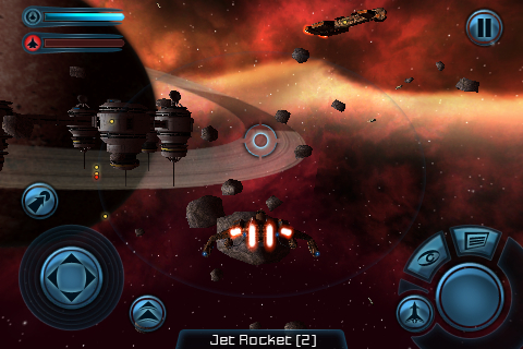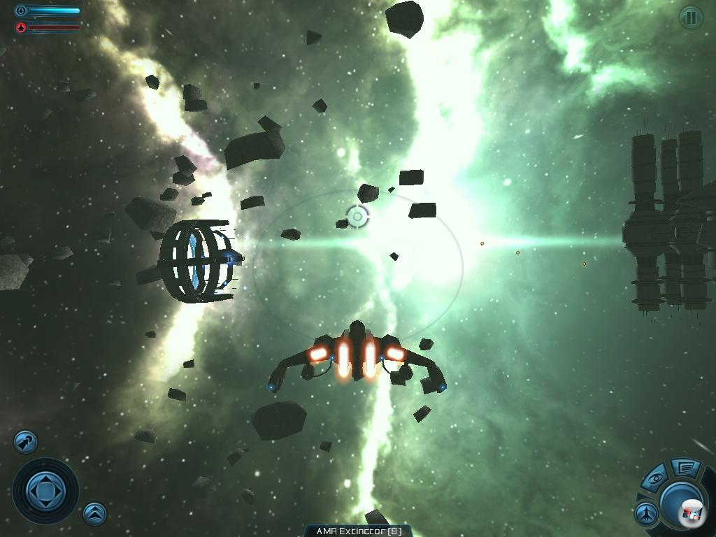 Ohnehin gibt sich ausgerechnet der Kern, das Fliegen und Kämpfen, leidlich spannend. Die Steuerung mit virtuellem Stick oder kippendem iNgabegerät ist für schnelle Gefechte viel zu ungenau und taktische Finessen hören dort auf, wo die Geschwindigkeit automatisch eingestellt wird. In vielen Fällen fehlt sogar eine Kollisionsabfrage, so dass Schiffe immer wieder durch ihre Gegner oder Asteroiden hindurch rauschen. Warum hat man keine taktischen Kämpfe inszeniert wie man sie aus verschiedenen Star Trek-Spielen oder Eve Online kennt. Gerade auf iPad könnte es verdammt cool sein, den totschicken Weltraum zu drehen und wie auf der Enterprise per Fingerzeig Anweisungen zu erteilen!