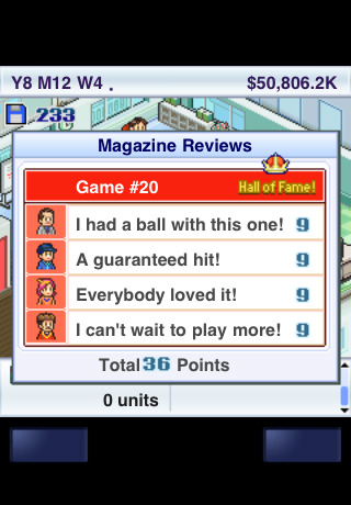 Außerdem habe ich den ersten Verkaufshit gelandet. Der Ehrgeiz ist geweckt, denn bei den Awards zum Spiel des Jahres habe ich es noch nie auf das ultimative Treppchen geschafft – ich bekomme immer nur Sonderpreise für Musik & Co. Ist ein Spiel endlich auf dem Markt, kann man sofort den Verkaufserfolg in Graphen beobachten und das Konto klingelt. Wichtig ist auch das Feedback der Presse: Vier Kritiker geben im Famitsu-Stil bis zu zehn Punkte sowie einen süffisanten Spruch à la „It made me cry“ oder „Boring“ zum Besten; erst ab einem hohen Schnitt wird das eigene Spiel in die Hall of Fame übernommen. Der Vorteil: Man darf erst dann einen offiziellen Nachfolger entwickeln, der natürlich schon auf einer Fanbasis aufbauen und weitaus mehr Hype erzeugen kann.