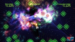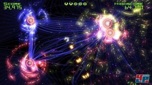 Begeistern kann vor allem aber die für die Klasse der Shareware-Ballereien perfekte Inszenierung. Nicht nur, dass die farbenfrohen HD-Effekte an ein besonders spektakuläres Silvester erinnern oder dass das einsame Stück Soundtrack zuverlässig Adrenalin durch die Venen pumpt: Höhepunkt ist der für das eigentliche Spiel unbedeutende Hintergrund, der wie ein Gravitationsfeld auf Projektile, schwarze Löcher und große Explosionen reagiert. Das blaue Raster schwappt dermaßen elegant und flüssig über den Schirm, dass ich dem Erfinder dieses Effekts um den Hals fallen könnte!