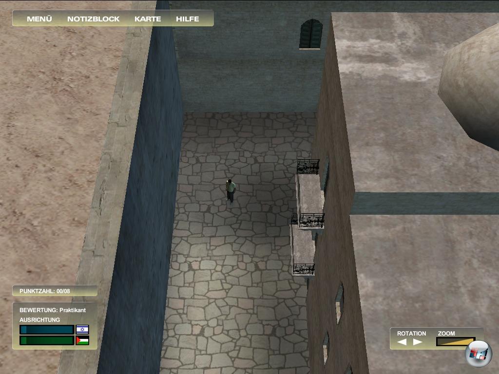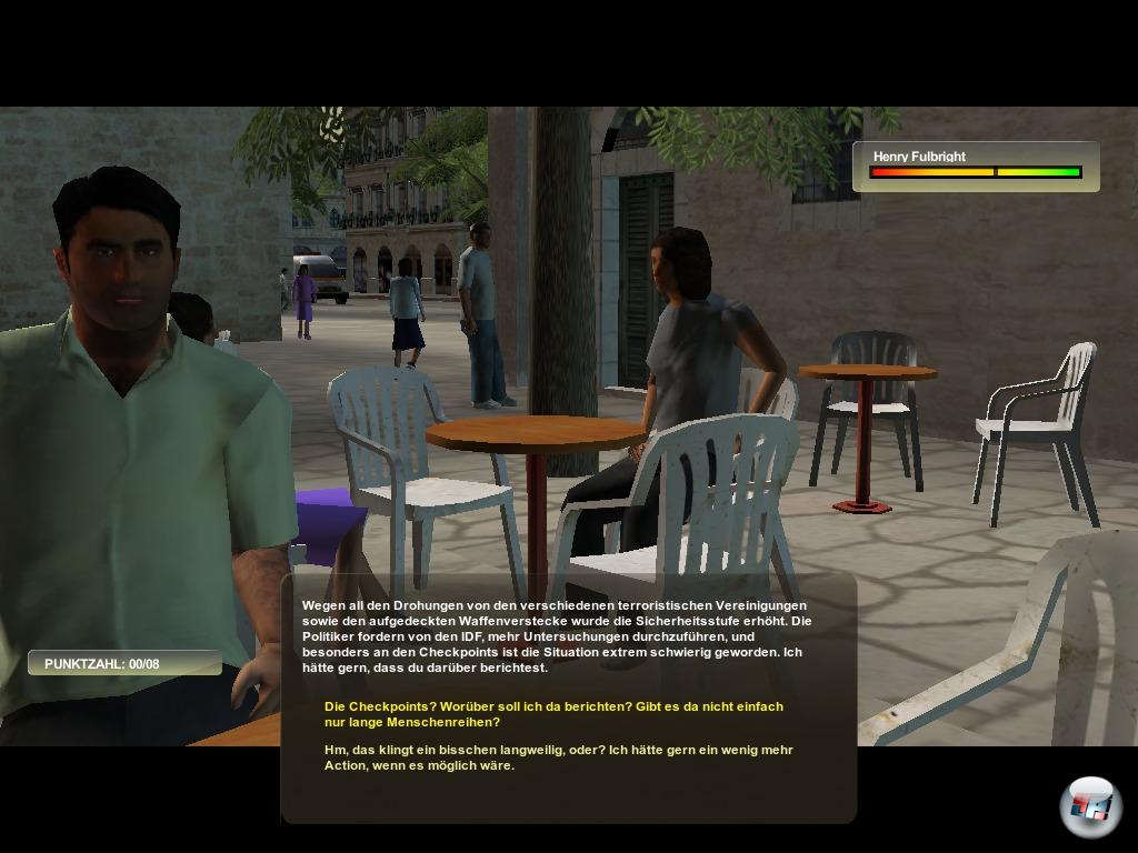 Doch zurück zur Recherche: Nicht jede der Personen freut sich übermäßig, wenn der virtuelle Reporter auf der Bildfläche erscheint. Manchmal müsst ihr erst über einen bestimmten Ruf bei der Fraktion (israelisch oder palästinensisch) verfügen oder zuerst eure „Loyalität“ unter Beweis stellen und kleine belanglose bis störende Aufgaben der Marke „Dienstbote“ absolvieren, wobei noch ein Schwachpunkt ins Auge sticht: Ihr könnt nicht allzu weit rauszoomen und müsst euren