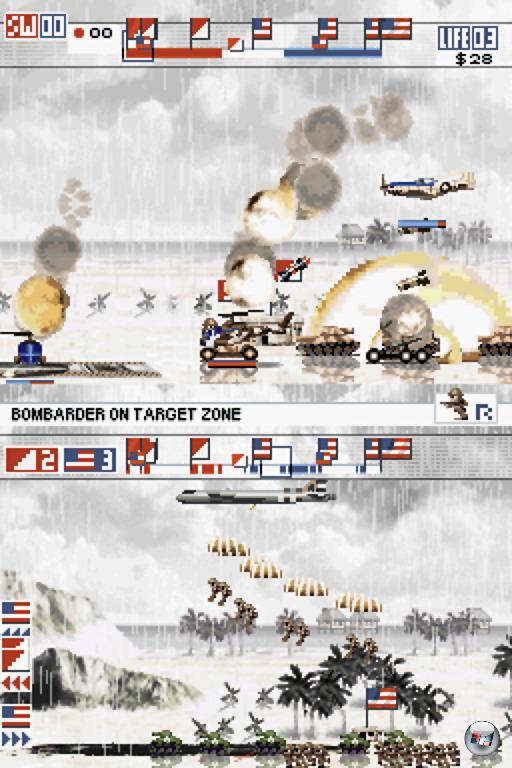 Bei all dem Bomben und Ballern dürft ihr aber auch nicht aus den Augen verlieren, dass euch nach und nach unvermeidlich die Einheiten ausgehen. Um das zu vermeiden, müssen Bunker eingenommen und Zivilisten gerettet werden, denn das gibt am meisten Geld – Geld, das ihr in neue Kameraden investieren sollt! Dazu drückt ihr zu einem beliebigen Zeitpunkt die R-Taste, woraufhin sich ein Baumenü öffnet, in dem ihr eure hart ersparten Kröten in Soldaten, Panzer oder Flugabwehrgeschütze investieren könnt – eure Maschine fliegt derweil auf Autopilot. Darüber hinaus müsst ihr stets mit euren Bomben- und Raketenvorräten haushalten, von denen ihr nur eine geringe Anzahl mit euch nehmen könnt – wird der Feuerbefehl nur noch mit einem müden »klick« quittiert, heißt es schnell zur Basis zurück und frische Knallkörper nachgetankt! Bei dieser Gelegenheit werden auch etwaige Schäden repariert sowie an Bord genommene Zivilisten in die Freiheit entlassen. Ganz gewiefte Füchse halten den begrenzten Bordplatz für Soldaten frei, die per Fallschirm hinter den feindlichen Linien abgesetzt werden können. Ständiges Taktieren ist also genauso wichtig die das aktive Ballern, man kann keinen der beiden Spielteile dauerhaft vernachlässigen.