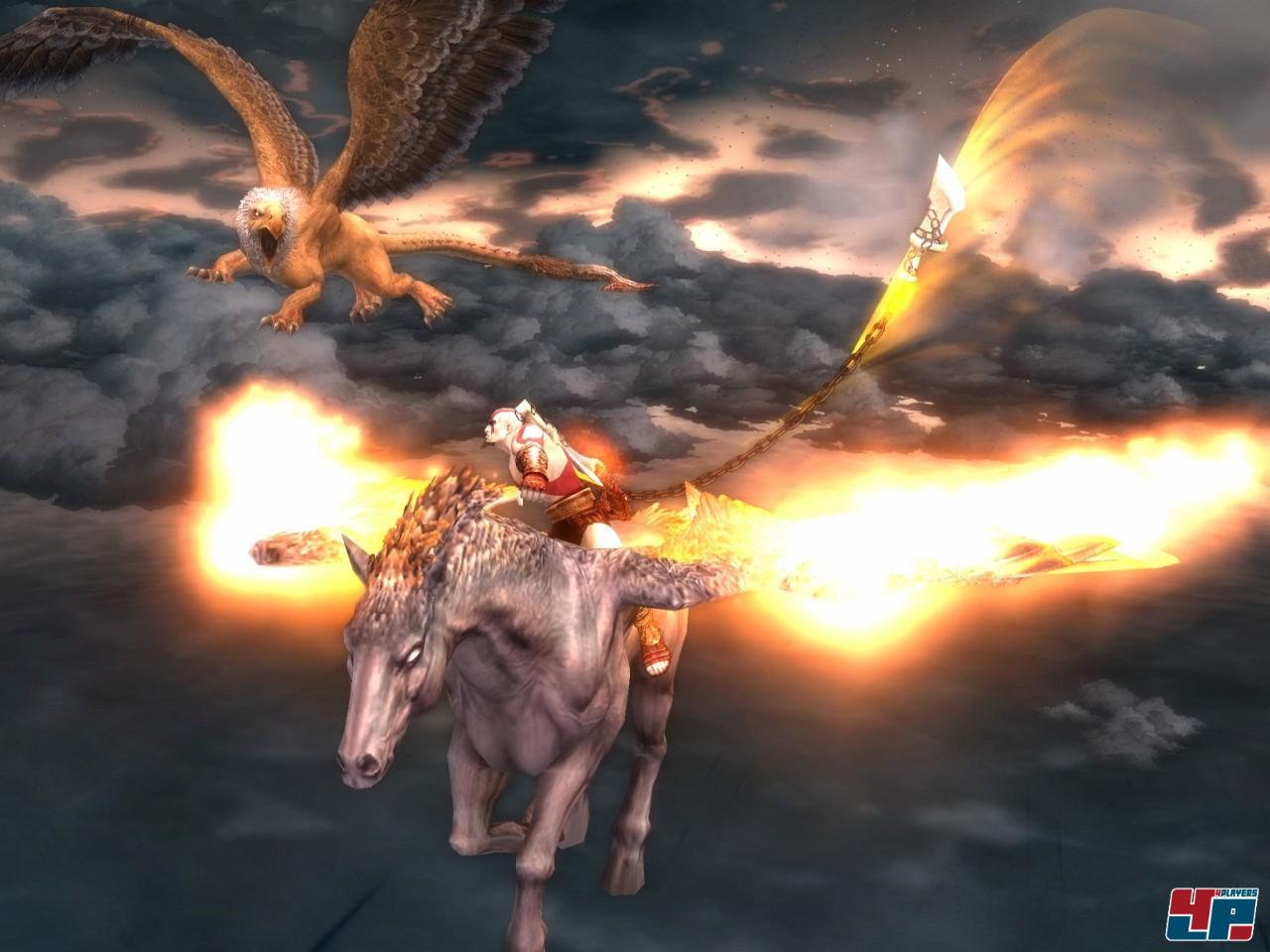 das eine oder andere benötigte Menschenopfer zu bringen. Auch die Bosse, teilweise auf Augenhöhe mit dem »Geist von Sparta«, teilweise mehrere Bildschirme füllend, sind von der harten Schule: Der Koloss von Rhodos, Theseus, Perseus, Euryale oder eine gigantische Krake liefern Kratos mit mehrstufigen Angriffsmustern einen harten Kampf – ohne das Erlernen derselben hat man gegen die variantenreich attackierenden Übermonster keine Chance. Auch wenn’s anders aussehen mag: Buttonmasher sind hier fehl am Platze. Alle anderen werden mit den guten alten Chaosklingen sowie neuen Waffen wie dem Schwert des Olymp, dem Barbarenhammer (Groß! Dick! Mit Spitzen!) oder dem Speer des Schicksals große Freude haben. Die klingen dienen jetzt auch vermehrt der Fortbewegung: Kratos kann jetzt nicht nur an Wänden, sondern auch an Decken entlang kraxeln, außerdem darf er an speziellen Haltepunkten wie ein Affe herumschwingen.