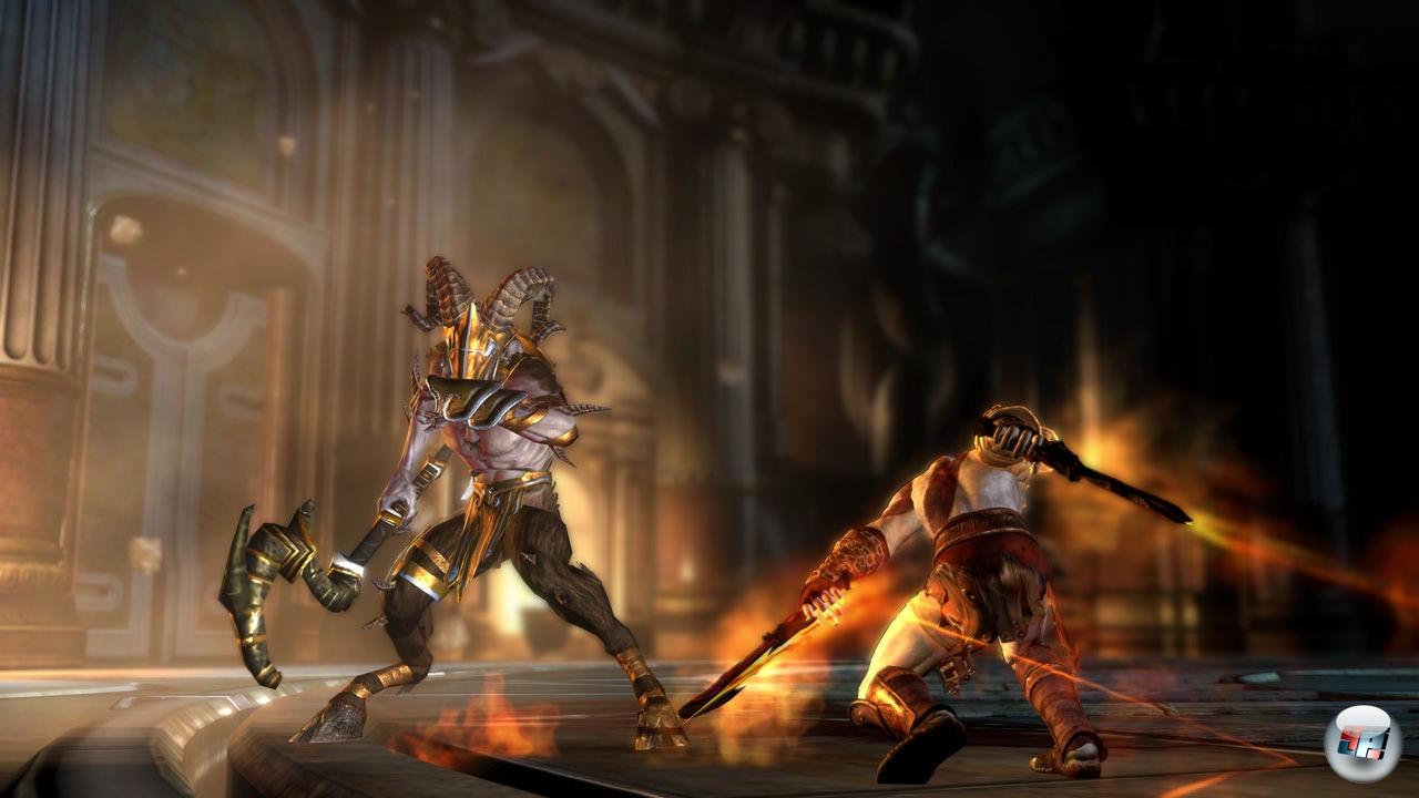 Eine schöne Neuerung findet sich außerdem mit dem Kopf des Helios: Hat man diesen erstmal von seinem eigentlichen Besitzer abgetrennt, lässt er sich in dunklen Höhlen und Räumen genau so verwenden wie etwa die Taschenlampe in Silent Hill: Shattered Memories. Außerdem lassen sich Gegner blenden, wenn man zuvor die Kraft auflädt. Zusätzlich hat der Kopf eine weitere nützliche Eigenschaft: Er kann versteckte Objekte wie Türen, Gemälde, Kisten oder Gegenstände sichtbar machen, wenn man direkt auf sie zeigt. Dazu muss man einfach Ausschau nach einem feinen Goldstaub halten, hinter dem sich meist eine Überraschung verbirgt. Dadurch ergibt sogar das relativ häufige Backtracking, als das erneute Aufsuchen von bereits bekannten Schauplätzen, einen Sinn, da man erst später mit Helios‘ Kopf ausgerüstet ist. Trotzdem hat man es hier teilweise etwas übertrieben – ich hätte lieber weitere Orte besucht anstatt z.B. immer wieder in der Schmiede oder bei den drei Richtern zu landen… Was nicht heißen soll, dass keine Abwechslung geboten wird. Ganz im Gegenteil: Die „Revenge-Tour“ des Spartaners führt ihn u.a. zurück in den Hades, in die Stadt Olympia, den Tartarus, auf und sogar in Titanen wie Gaia und Kronos sowie das Labyrinth des Daedalus – und direkt ins Schlafgemach der attraktiven Aphrodite, wo die obligatorische, aber in diesem Fall bewusst optionale Sexszene wartet, die dieses Mal – wie versprochen – in die Geschichte eingebunden wurde. Das Artdesign ist ähnlich genial wie bei Dantes Inferno; nur auf eine andere Weise: Während der Abstieg durch die neun Höllenzirkel vor allem durch verstörende Motive visualisiert wurde, überzeugt God of War III vor allem durch die unglaubliche Größenwirkung und die monumentale Architektur der antiken Götterwelt. Während die Konkurrenz aus dem Hause EA zudem gegen Ende merklich abbaut, hält der Sony-Krieger während seiner ganzen Reise das extrem hohe Niveau der Kulissen und die Abwechslung aufrecht. Ich habe in den gut zehn Stunden keinen Moment erlebt, bei dem ich mich gelangweilt habe oder hoffte, einen Schauplatz schnell hinter mich zu bringen. Stattdessen blieb ich manchmal sogar stehen, um einfach die fantastische Aussicht zu genießen, wenn in der Ferne Tornados toben und die Erdoberfläche von glühenden Lavaflüssen durchzogen wird, die wie pulsierende Adern wirken. Neben der Metzelaction und Rätseln stehen zwischendurch auch immer wieder Trial & Error-Passagen auf dem Programm, bei