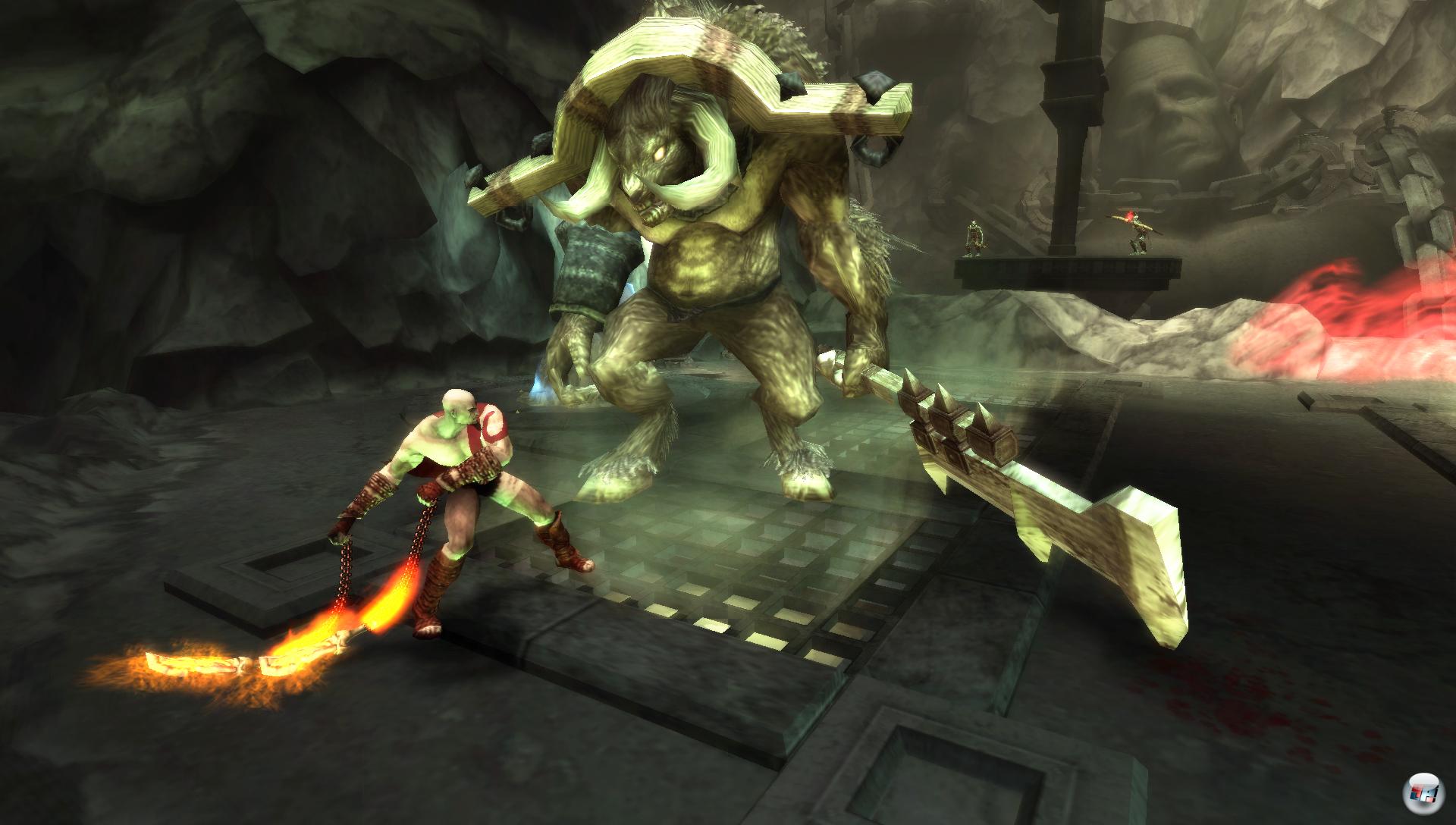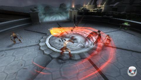 auf die Negativpunkte hinzuweisen: Tradition ist Tradition, deswegen muss sich auch der PSP-Gott mit gelegentlichem Ruckeln und Tearing herumschlagen. Die manuell nicht verstellbare Kameraperspektive ist nicht immer optimal gewählt, der Schattenwurf ist merkwürdig (wenn Kratos springt, wird er unnatürlich vergrößert). Und all die Pracht hat natürlich ihren Preis: Dadurch, dass das Spiel nativ auf 333 MHz läuft und ständig von der UMD streamt, solltet ihr besser ein Ladegerät in ständiger Nähe haben – nach etwa zwei Stunden durchgehendem Spiel ist der Standard-Akku leergelutscht.