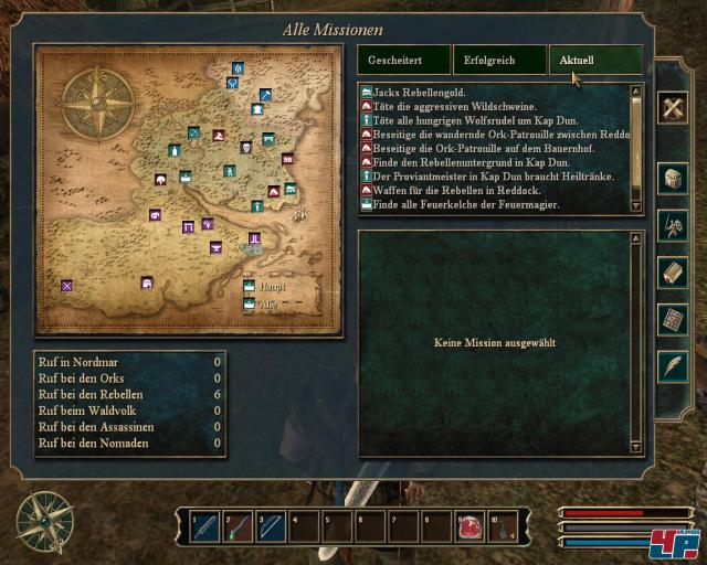 Vielleicht hätte es geholfen, schon früher einen Verbindungsmann einzustreuen, der etwas über den König oder den Kontinent erzählt, oder Zwischensequenzen, die die schrecklichen Momente der Besatzung zeigen. Es fällt mir als Abenteurer auch schwer, mich selbst über das Reich Myrtana zu informieren. Im Gegensatz zu Oblivion gibt es hier kaum Bücher, die etwas über die Geschichte, die Wesen oder Eigenheiten des Landes verraten. Auch das Handbuch zeigt sich hier sehr spartanisch. Wie soll man da einen Bezug zum König aufbauen? Zumal man als namenloser Held ohnehin keine Biografie, keine Ansatzpunkte für Identifikation hat.