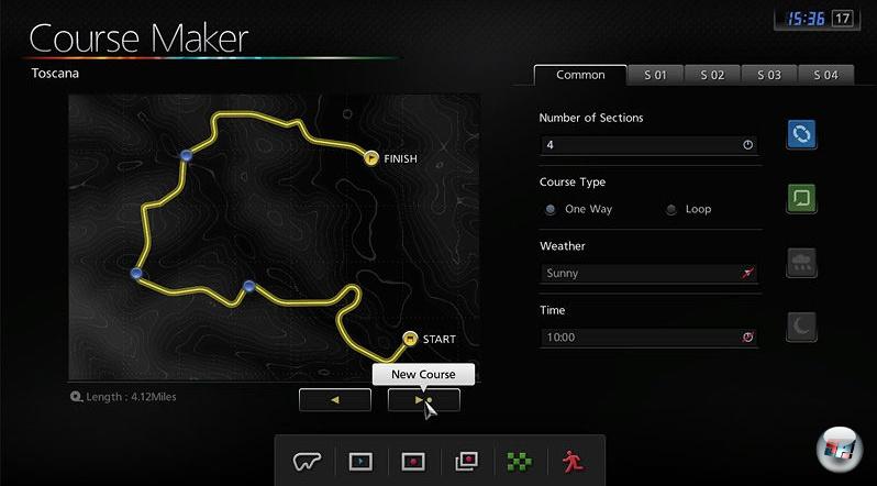 Hat man sich entschieden, geht es anschließend in den eigentlichen Editor. Dort bestimmt man zum einen die Anzahl der Sektoren (maximal sieben sind erlaubt) und zum anderen für jeden einzelnen Sektor die Werte für die Komplexität des Abschnitts, den Kurvenradius sowie die Breite der Strecke. Wetter und die Tageszeit dürfen ebenfalls angepasst werden. Klar, dass man damit weit von der Vorstellung eines klassischen Streckeneditors entfernt ist. Das Ganze erinnert mich viel mehr an