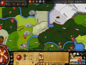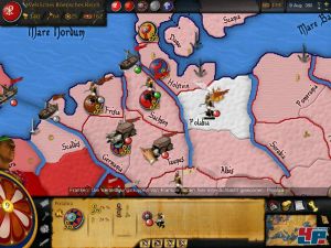 Great Invasions, das auch äußerlich stark an das ebenfalls von Philippe Thibault stammende Pax Romana erinnert, bietet in den vier Schlüsselbereichen Militär, Wirtschaft, Diplomatie und Religion mehr Handlungsmöglichkeiten als Rome – auch wenn die Zahl der Stadtausbauten nicht ganz erreicht werden. Ihr könnt z.B. Truppen ausheben, Wirtschaftsgebäude errichten und Handelsverträge schließen. So weit so gut. Wer sich nun aber schon aufs ausgiebige Regieren freut, sei gewarnt, denn das Spiel hat trotz neugierig machender Thematik klare Macken. So ist das Verwalten eures Reiches derart umständlich, dass euch schnell die Lust daran vergeht. Wer etwa eine Armee in ein anderes Land schicken will, muss sich dafür erst durch mehrere Menüs klicken, bei denen einem schon einmal die Übersicht flöten gehen. Auch der Gebäudebau ist total versteckt. Da es verschiedene Kartenansichten gibt, die sich nicht gleichzeitig anzeigen lassen, ist ständiges Hin- und Herwechseln gefragt.