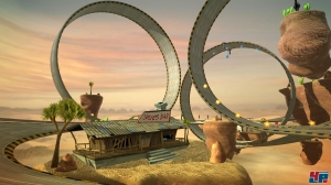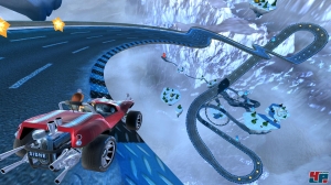 Dort seid ihr nämlich selten auf ebenem Asphalt unterwegs. Stattdessen sammelt ihr Turbos, rast über Unebenheiten und springt an Schanzen ab: Die Kurse führen euch ständig dorthin, wo sonst eine unsichtbare Wand steht. Bei mir hat es wegen der schwammigen, indirekten Steuerung allerdings eine Stunde gedauert, bis ich die sechs Vehikel sicher über die Pisten lenken konnte. Wenn ihr wollt, dürft ihr euer Fahrzeug in der Luft zwar mit der Sixaxis-Steuerung bewegen, allerdings könnt ihr es so nur nach vorne oder hinten kippen; lenken müsst ihr auch beim Fliegen mit dem Analogstick. Ganz offensichtlich