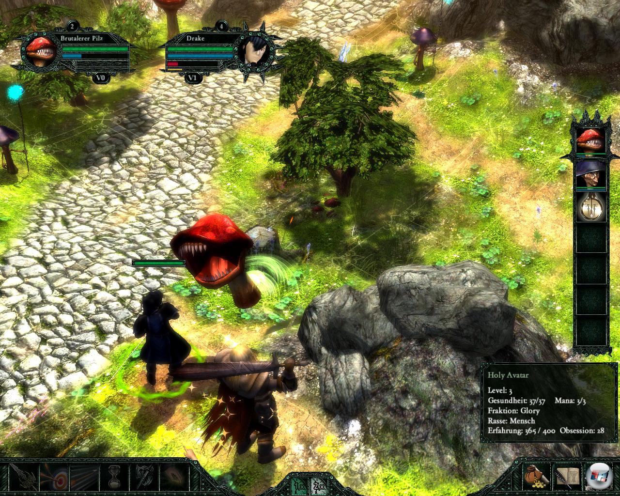 Auch bei Grotesque trifft man immer wieder auf Anleihen an die „Pythons“, etwa wenn einen im Dungeon brutale Killerkaninchen attackieren. Das ist nur einer der Seitenhiebe, manches erinnert fast an Terry Prachett, da die Helden auch ihre Schwächen haben. Der Held kämpft etwa gegen Menschen fressende Pilze, auf deren „Dienste“ er zu Beginn zurückgreifen will. Das ist zumindest neu, denn bislang hatten wir nur etwas von Pilz fressenden Humanoiden gehört. Silent Dreams machen in ihrem Rollenspiel viele Fässer auf, aber nicht eins davon wird annähernd ausgeschöpft. So greift man auch nicht auf die heilige Handgranate von Antiochia zurück, sondern wie üblich auf Schwert, Harfe und Bogen, um die gefährlichen Nager zu plätten.