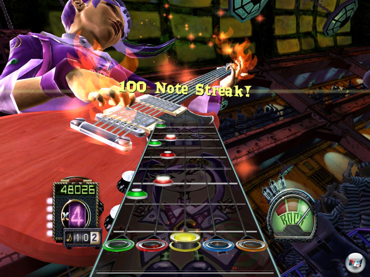 Wer die Vorgänger kennt, darf gleich zum nächsten Absatz hetzen, denn es folgt eine kurze Beschreibung dessen, was Guitar Hero eigentlich ist. Wenn ihr schon mal ein Rhythmusspiel à la Samba De Amigo oder Dance Dance Revolution gespielt habt, dann dürftet ihr eine ziemlich klare Vorstellung davon haben, was euch erwartet: Je nach Schwierigkeitsgrad fliegen euch mehr oder weniger Noten entgegen, die ihr zum richtigen Zeitpunkt und in der richtigen Höhe treffen müsst – dann erschallen wohlfeile Klänge, der Multiplikator schnellt in die Höhe, das Publikum zappelt in Ekstase. Falls ihr es vermasselt, macht es »Klink!«, Klank!« und »Raböm!«, die Punkte stagnieren, das Publikum räuspert sich für ein gut geöltes »Buuuuuuh!« und das Game Over naht. Um das zu vermeiden, sammelt ihr