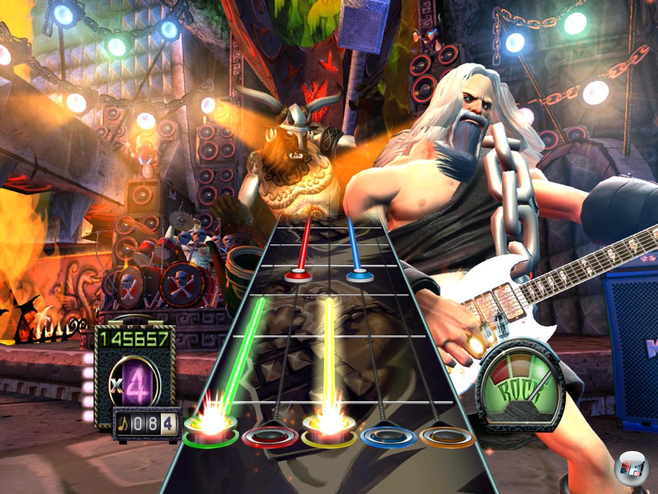 Star nach oben, woraufhin Blitze um das Notenfeld herum bratzen, das Publikum völlig ausflippt und der Punktemultiplikator für kurze Zeit in ungeahnte Höhen schießt. Die Gitarre? Ja, die Gitarre: Auf dem Stück Plastik, optisch dieses Mal einer Gibson Les Paul nachempfunden, befinden sich fünf farblich markierte Knöpfe (»Frets«) und ein Anschlagshebel (»Strum«) – Erstere repräsentieren die Noten, mit Letzterem werden sie angeschlagen. Klingt einfach? Ist es ja eigentlich auch, wenn man etwas Rhythmus im Blut sowie Geduld hat. Denn am Anfang (sprich: auf »Easy«) werden gerade mal drei Frets genutzt, entsprechend wenig Noten müsst ihr treffen. Auf »Medium« gibt’s vier Frets und mehr Ziele, auf »Hard« wird das gesamte Frets-Spektrum genutzt – und auf »Expert« werdet ihr von in Lichtgeschwindigkeit auf euch zurasenden Noten erschlagen! Die Schwierigkeitsgrade sind sehr gut abgestuft, die Songs werden im Laufe der Karriere spürbar schwieriger – und wenn ihr partout an einem Lied verzweifelt, wartet immer noch der nach wie vor ungeschlagene Übungsmodus, in dem sich die Songgeschwindigkeit so weit runterkurbeln lässt, dass selbst ein »Through the Fire and Flames« an Biss verliert. Aber dazu gleich mehr.