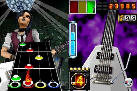 Unbequemer wird’s da schon bei der »Gitarrenschlacht«, der hiesigen Variante der aus Guitar Hero 3 bekannten Boss Battles: Die gibt es hier nicht, stattdessen könnt ihr in allen Songs gegen die KI antreten – oder gegen einen Kumpel! Prinzipiell funktioniert auch alles ganz wunderbar, mit einer Ausnahme: Der Aktivierung der Power-Ups! Aus irgendeinem Grund werden sie nicht wie die Star Power durch Gepuste oder Tastengedrücke auf den Gegner abgefeuert. Oh nein, stattdessen müsst ihr den Stylus absetzen und eines der Icons anklicken, das links oben auf dem Touchpad auf seinen Einsatz wartet. Das Problem ist offensichtlich: Während ihr das macht, könnt ihr keine Noten spielen, ein Einsatz ist also nur in Spielpausen möglich, was natürlich den Überraschungseffekt ruiniert. Wie man es auch dreht und wendet, es gibt keine vernünftige Möglichkeit, den Feind mal eben mit einer Batterie an Fiesheiten einzudecken, ohne selbst Punkte zu verlieren – das ist dumm! Was umso bedauerlicher ist, als dass der Modus an sich hervorragend umgesetzt ist. Die WiFi-Verbindung klappt wunderbar, es gibt eine bemerkenswerte Anzahl an Items: Ihr könnt euer Gegenüber kurzzeitig blenden, eine seiner Saiten reißen lassen, seinen Schwierigkeitsgrad oder seine Geschwindigkeit erhöhen, hysterische Fans stürmen die Bühne und begehren nach schnell gekritzelten Autogrammen und einige Noten verwandeln sich in Bomben, die man tunlichst nicht erwischen sollte. Es gibt auch Defensiv-Items, die einem selbst nützen: Man kann Angriffe des Konkurrenten verhindern, die eigene Geschwindigkeit senken oder einfach Angriffsicons klauen. Neben der Gitarrenschlacht warten noch drei weitere Spielvarianten auf zwei Hosentaschenrocker: »Face Off« und »Pro Face Off«, in denen man mit unterschiedlicher oder gleicher Notenzahl gegeneinander antritt, sowie »Koop«, wo ihr gemeinschaftlich einen Song in Angriff nehmt – unterteilt in Lead-, Rhythmus- und Bassgitarre.