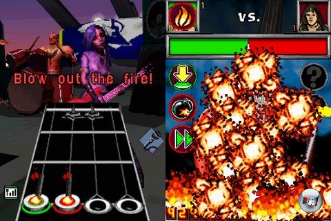 Die auffälligste Änderung innerhalb der Songs ist die Aktivierung der Starpower: Den DS ruhmreich in die Lüfte zu recken bringt nichts, stattdessen müsst ihr ihn einfach anpusten – oder anrülpsen, falls euch das rockerhafter vorkommt. Falls euch beide Varianten die Schamesröte ins Gesicht treiben, könnt ihr auch einfach das Digipad anstupsen, was allerdings ein Umgreifen voraussetzt – die Nutzung der Schultertaste, an der ohnehin der Daumen der