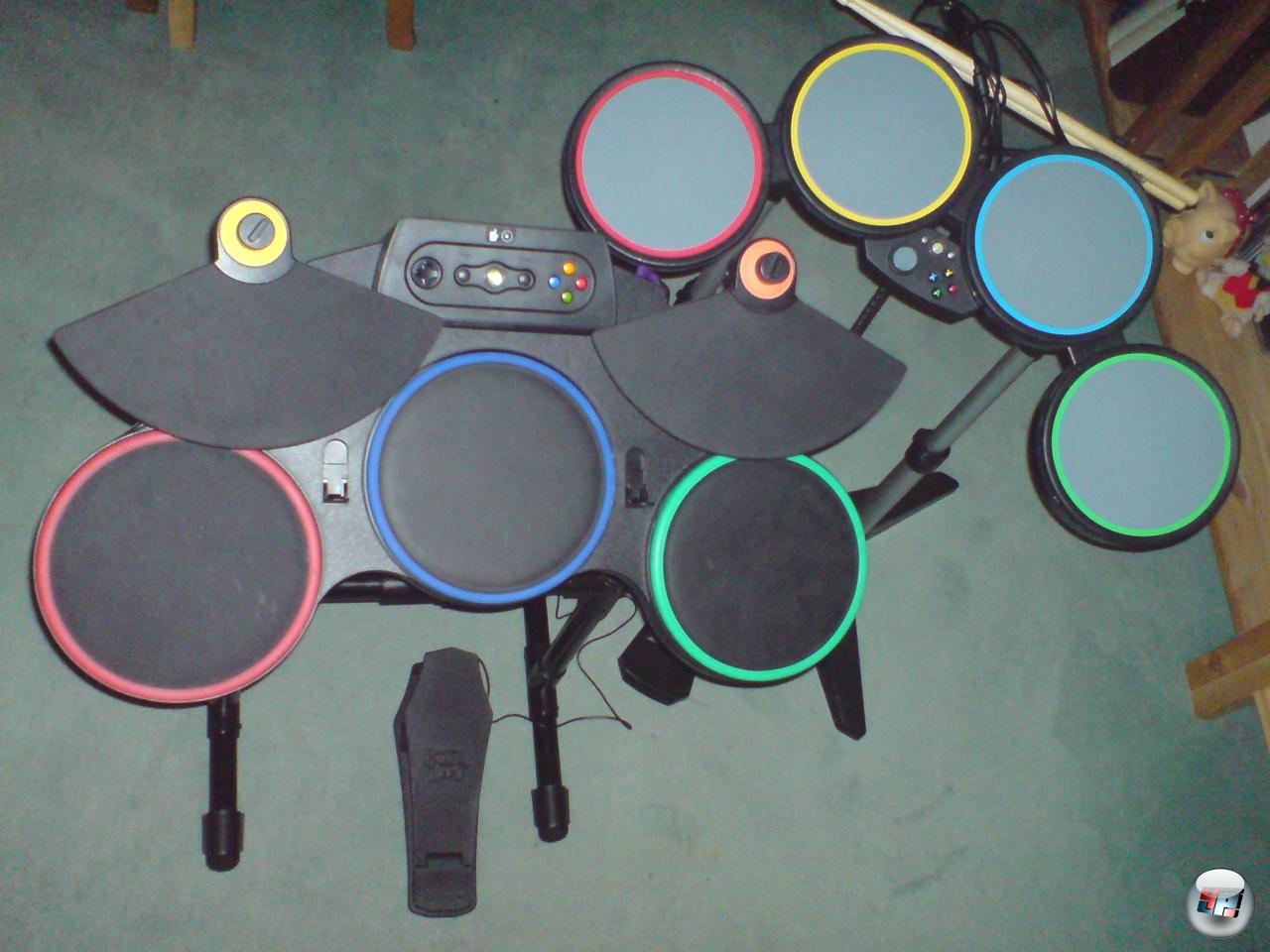 Der wichtigste Neuzugang im Guitarheroversum ist natürlich das Schlagzeug. Und optisch macht das Teil ordentlich was her: Die drei Drums, die sich halbkreisförmig um den Spieler verteilen, sind wunderbar groß und vermitteln ein tolles, präzises Anschlagsgefühl – wobei sie nicht so plastisch laut