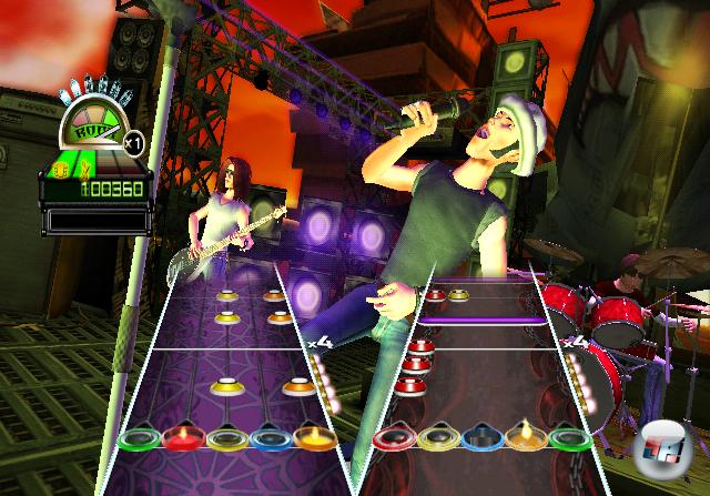 Wii-Rocker werden fair behandelt: Hier wird ihnen etwas weggenommen, woanders etwas dazugegeben. Die schlechte Nachricht zuerst: Ihr dürft weniger Songs runterladen – zwar gibt es einzelne Tracks zum Download (die auf SD Card gespeichert werden), aber keine Alben. Als Ausgleich hat Entwickler Vicarious Visions einen »Mii Improvisation«-Modus integriert: Hier dürfen Gitarrist und Schlagzeuger gleichzeitig ran, um… nun… abzujammen. Es gibt keine Vorgaben (außer Notenkarten, die ihr nachspielen könnt, aber nicht müsst), der ganze Modus dient nur dem Freestyle-Klampfen und -Kloppen mit euren Miis. Klingt simpel, ist simpel, macht aber auf bizarre Weise Spaß. Und ist als Bonusinhalt weitaus wertvoller als Wii Music <a class="DYNLINK" onmouseover="DynToolTipp_Show('Klicken für Gameinfos‚)“ onmouseout=“DynToolTipp_Hide(); “ href=“javascript:DynCont_Display(‚Gamefinder‘,’runmod.php?sid=%7BSID%7D&LAYOUT=dyncont_gf&spielid=10518′)“>