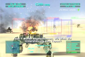 Masochistisch veranlagt sein muss man aber auch beim Ertragen der Einzelspielerkampagne, die aus willkürlich zusammen gewürfelten Schutz- und Zerstörungseinsätzen besteht, die so abwechslungsreich sind wie das Liedgut von Modern Talking oder die Gegner im Pillen-Klassiker Pac Man. Pillen könntet aber auch ihr vertragen, wenn ihr mit einem der über ein Dutzend Mechs in den Kampf zieht – und zwar Kopfschmerztabletten. Wie es die Entwickler überhaupt geschafft haben, die Bildrate trotz akuter Polygonarmut, vorsintflutlicher Mageranimationen, eklatanter Popups und primitivster Billigeffekte so niedrig und instabil zu halten, dass man davon früher oder später Kopfweh bekommt, ist mir allerdings absolut schleierhaft. Für die KI können jedenfalls kaum Ressourcen drauf gegangen sein, denn so blöd wie sich eure CPU-Partner und -Gegner verhalten, kann es sich hier nur um zufallsgenerierte Verhaltensmuster handeln und auch die bis auf die Explosionen extrem öde Soundkulisse dürfte trotz Dolby Digital-Kodierung kaum Rechenzeit in Anspruch nehmen. Vielleicht wird im Hintergrund ja versucht, den Sinn des Spiels zu berechnen, was wohl selbst für die modernste Hardware eine nicht lösbare Aufgabe darstellen dürfte…