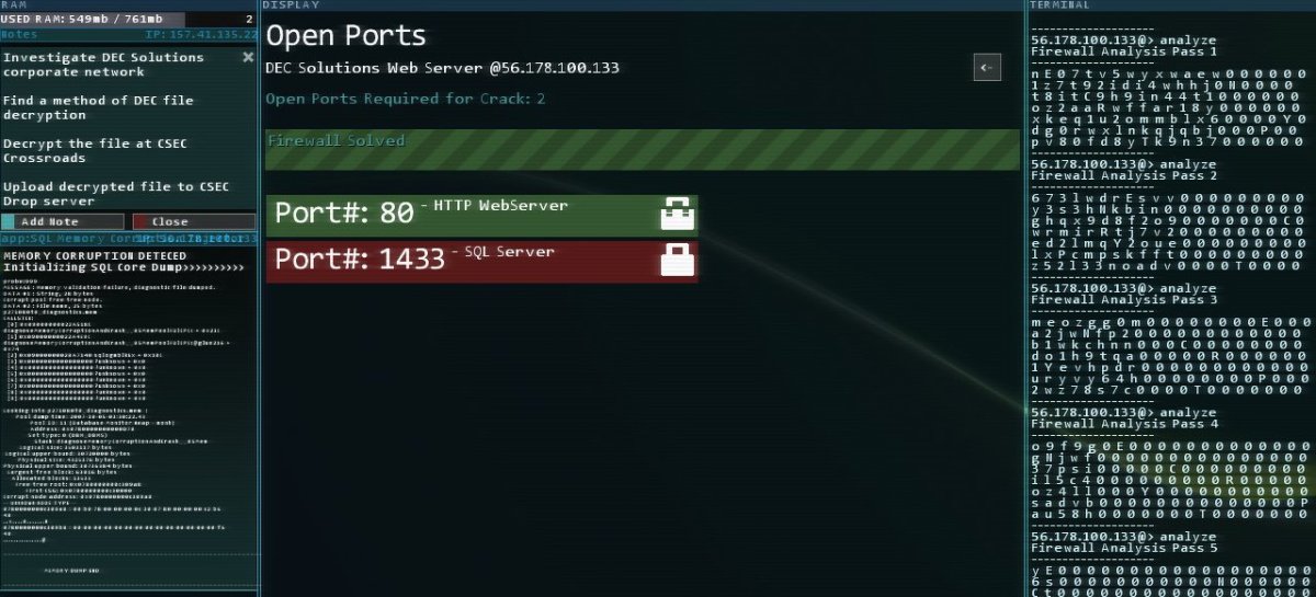 Diese einfache Art, das Spiel Realität werden zu lassen, ist die große Stärke von Hacknet. Es verlässt nie die Ebene des Blicks auf den Bildschirm und ganz wichtig: Es lässt seine Spieler mit echten Befehlen arbeiten, anstatt sie durch Menüs zu lotsen. Viele Schritte kann man zwar vereinfachen – das E-Mail-Programm ist etwa auf dem grafischen Teil der Benutzeroberfläche mit Maus erreichbar. Für das Hacken ist die Kommandozeile aber unerlässlich. Man muss sogar darauf achten, dass nicht zu viele Programme laufen, weil die sonst den Hauptspeicher blockieren.