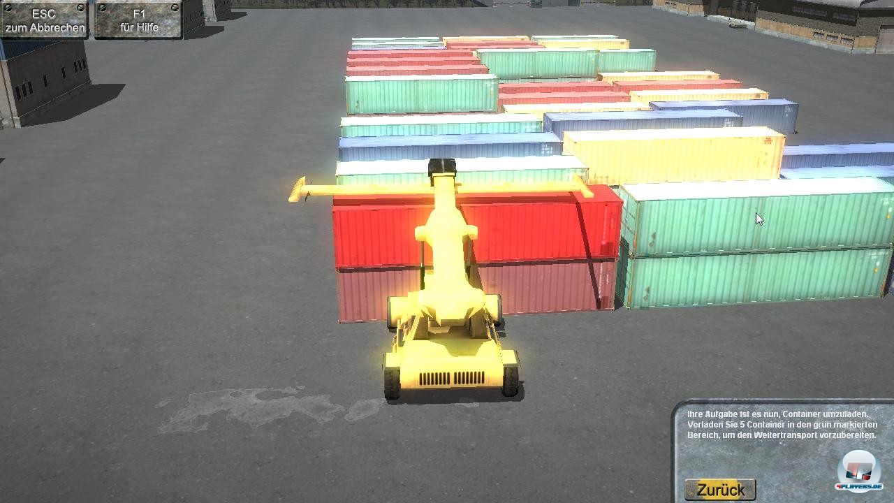 Man beginnt also als Malocher im Hafen XY, der Mission für Mission absolvieren muss. Oder eher nachmachen, denn es geht eigentlich immer darum, dass man eine bestimmte Menge Container irgendwo hinbringt. Zu Arbeitsbeginn sind das drei Kisten per Kran auf den Frachter, der allerdings ein kleines Containerschiff ist. Statt der rund 11.000 Blechkisten, die auf die Emma Mærsk passen, dem weltgrößten Containerpott, fasst der hier grad mal ein paar Dutzend. Dann muss man fünf Container mit dem Gabelstapler an eine bestimmte Stelle bringen, was dank eingängiger Steuerung beim Aufladen sogar recht flott geht. Hat man einen Auftrag erledigt, kann man zuschauen, wie das Schiffchen ablegt, was aber nicht sonderlich beeindruckend aussieht.