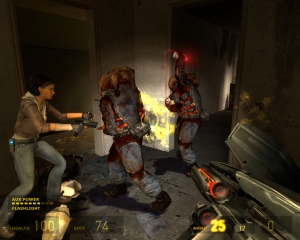 genauso aufgemotzt wie in HL2 erst kurz vor dem Ende – anfangs seid ihr eine ziemlich lange Zeit unbewaffnet und müsst euch mit allerlei geworfenen Dingen verteidigen, erst später kommen die gewohnten Waffen ins Spiel – und das berühmte Brecheisen hat erst kurz vor Schluss seinen Auftritt. Die euch entgegen wankenden und –schwirrenden Feinde wurden komplett aus dem Vorgänger übernommen, lediglich ein Neuling findet sich im Feindesland: der Combine-Zombie, von Alyx scherzhaft Zombine genannt. Außerdem bekommt ihr jetzt die passiven Stalker, die in HL 2 nur aus der Entfernung zu begutachten waren, etwas näher zu sehen. Und nicht zuletzt sind auch die bekannten Nebenfiguren wieder dabei: Barney, Dr. Kleiner, Eli Vance oder Dr. Breen feiern mehr oder weniger große Cameo-Auftritte.