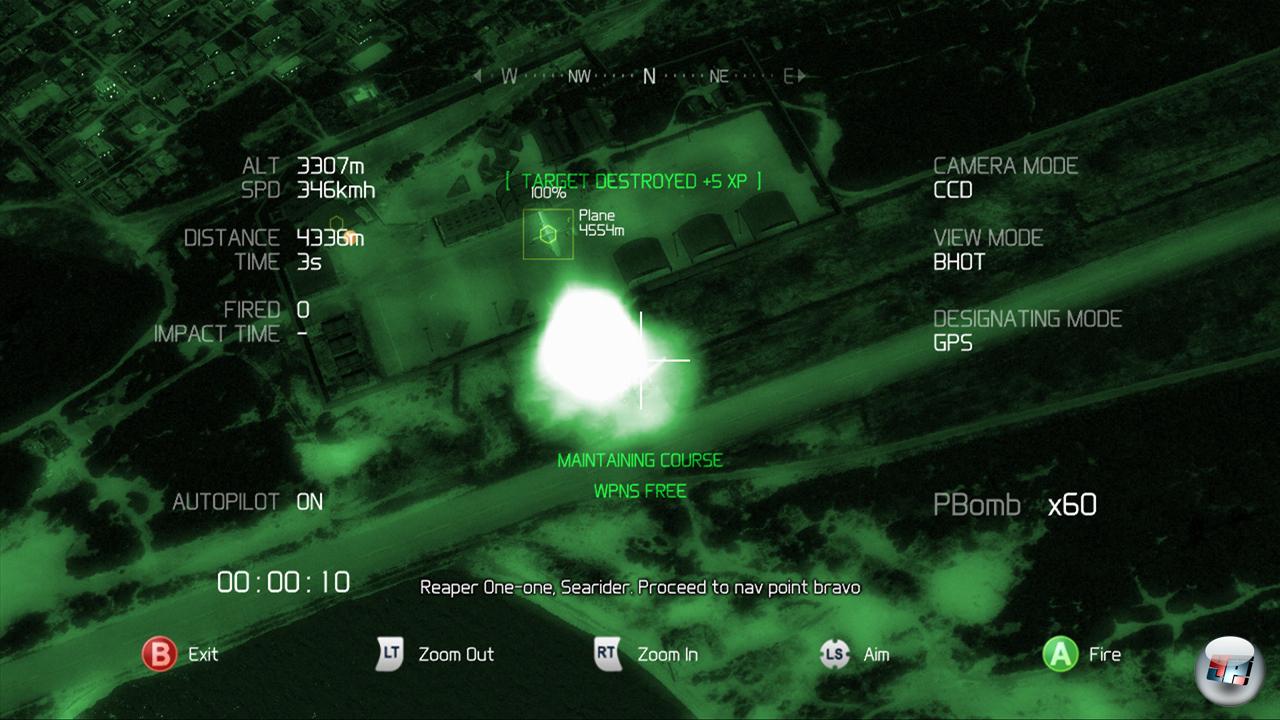 Darüber hinaus schubsen mich die Designer ein paar Mal weg vom Flightstick und hin zum Kameracontroller: Hin und wieder übernehme ich die Kontrolle über eine bewaffnete Drohne, um damit aus der Luft Fahrzeuge oder andere Ziele zu markieren, Gebäude zu scannen oder Raketen in Richtung Boden zu schicken. Ein Mal verlasse ich auch den Steuerknüppel einer hoch fliegenden F-35 und zerbombe mit der automatisch weiter fliegenden Maschine die tief unter mir liegende Stadt. Frei nach Call of Duty: Modern Warfare gibt es auch einen Auftrag, in dem man die 40- und 105mm-Geschütze einer C-130 übernimmt und aus der Luft die Flucht eines Agenten deckt. Spaßig sind auch die (leider zu seltenen) Luftbetankungen, in denen man sich vorsichtig an das Tankflugzeug heranschieben muss. Alles schön und gut, aber gerade mit den UAV-Aufträgen haben es die Entwickler übertrieben – speziell in der Spielmitte haben sich diese Missionen nicht nur gehäuft, sondern auch ziemlich in die Länge gezogen. Generell sind die Levels dieses Mal ziemlich lang; bloß gut, dass vor wichtigen Stellen automatisch Checkpunkte angelegt werden, die auch Bestand haben, wenn man das Spiel verlässt.