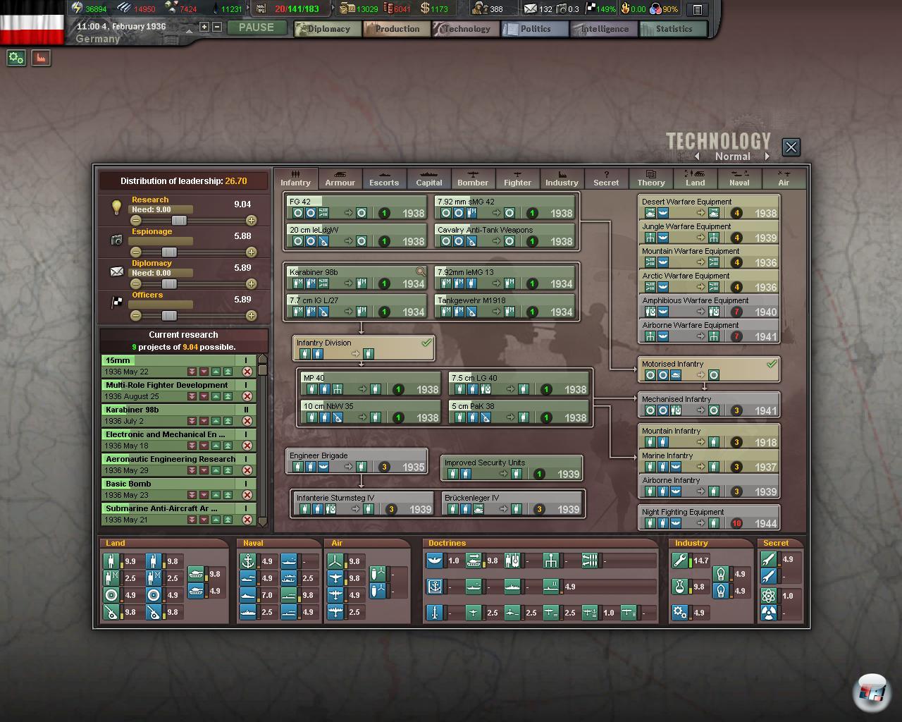 mehr Technologien erfinden, denn es gibt nicht mehr die zeitgenössischen Wissenschaftler wie Otto Hahn, die im Labor einzelne Aufträge durchführen wie beim zweiten Teil. Dieses Mal verteilt man im Menü Forschungspunkte, die sich direkt in Aufträge ummünzen lassen, was einfacher ist. Wer fünf Punkte vergibt, kann ebenso viele Forschungen durchführen. Er kann etwa bessere Panzerung, Infanteriebewaffnung, Bauingenieurwesen, Atomspaltung und das Konzept des Blitzkrieges erforschen lassen.