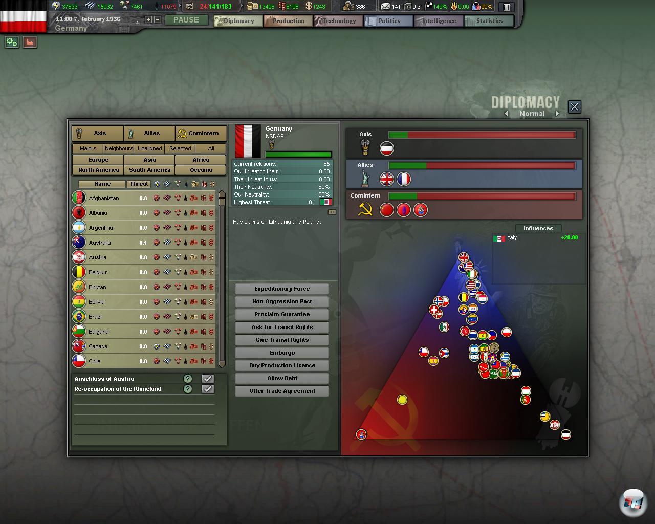 Die wichtigste Neuerung ist hier sicher, dass man neben der normalen Aufrüstung auch diplomatische Aufträge erhält. Ein Beispiel ist der Einmarsch ins nichtmilitarisierte Rheinland, den einige noch aus dem Geschichtsunterricht kennen dürften. Es geht darum, dass die deutschen Provinzen am Rhein eigentlich laut Versailler Vertrag ohne Truppen auskommen mussten. Man bekommt als Deutscher den Auftrag, dies zu ändern. Eine bestimmte Anzahl von Provinzen im Westen ist zu besetzen, 40 Divisionen sind aufzustellen und der Friede mit Frankreich ist zu wahren. Das Interessante ist, dass die Quests aufeinander aufbauen. Die Wiederbewaffnung ist Voraussetzung, dass man irgendwann Österreich anschließen darf. Den Anschluss gab’s Hearts of Iron 2 noch zum Nulltarif.