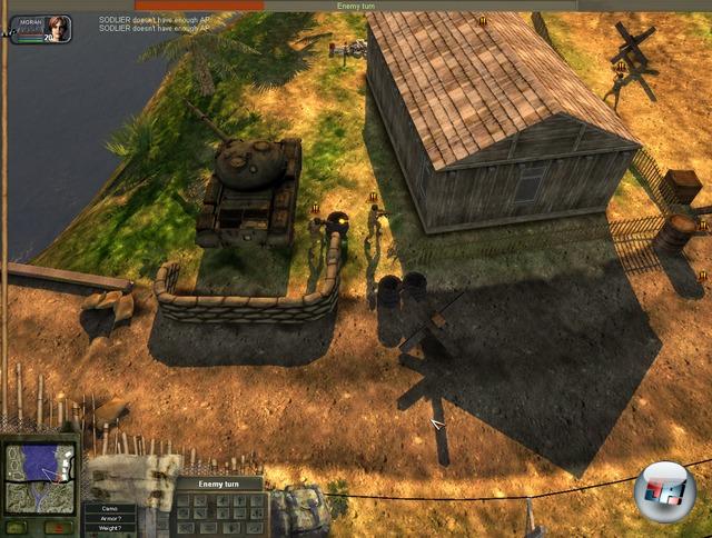 Weiter geht es in stolz nachgemachter Jagged Alliance-Tradition mit der Erstellung eines eigenen Söldners anhand eines Fragebogens, der stellenweise zum Schmunzeln anregt und ansonsten wie eine billige Kopie aus dem scheinbar übermächtigen Kultspiel wirkt. Nach spärlichen Individualisierungsmöglichkeiten bei Stimme und Portrait verteilt ihr Charakter-Werte auf Attribute wie Beweglichkeit, Geschicklichkeit, Sprengmeister, Sanitäter oder Führungskraft, wobei leider nicht alle selbsterklärend sind; klarere Tooltipps als „Fähigkeit das Team anzuführen“ hätten sicher geholfen. Ist euer eigener Söldner dann für einen kleinen Obolus erstellt worden, wird er gleich wie alle anderen angeworbenen Kämpfer in den gewählten Sektor teleportiert; gleiches passiert mit den bestellten Waffen, Transporthubschrauber sind out. Im Kriegsgebiet angekommen lassen sich eure Kämpfer mit wenigen Mausklicks zu einem Team formieren und ausrüsten, falls notwendig.