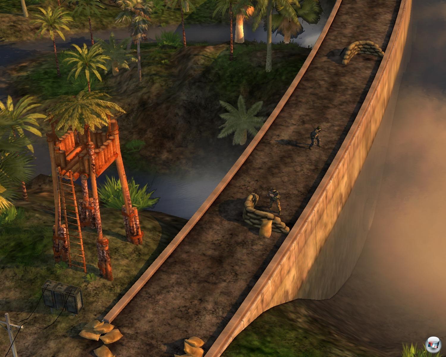 Einem Jagged Alliance-Kenner fällt gleich die völlig abgespeckte, fitzelig kleine Aktionsleiste am unteren Bildschirmrand auf, aber zumindest überlebenswichtige Befehle wie „Hinlegen“ sind vorhanden. Apropos „Hinlegen“: Dank dem 3D- System spielt euch das Sichtsystem oft einen Streich. Wenn sich ein Gegner auf dem Boden legt und ihr genau wisst wo er sich befindet, kann euer Söldner ihn wohl möglich nicht angreifen, da eine Mini-Bodenwelle oder ein anderes Hindernis die Sichtlinie stört. Und wenn nicht die Sicht blockiert ist, könnte ein Baum oder irgendein anderes Objekt die Schussbahn des Projektils jäh beenden – manchmal könnt ihr das Sicht verschluckende Objekt gar nicht sehen. Furchtbar unnütz ist außerdem die Minikarte, die viel zu klein ist, um darauf etwas erkennen zu können.