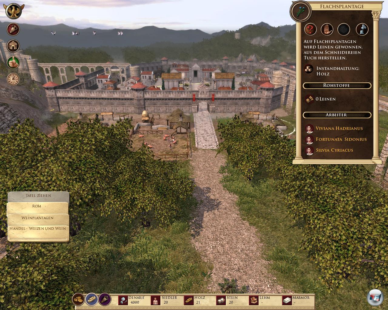 Alles, was ihr nicht verbraucht, könnt ihr auch handeln. Ihr baut einfach einen Schiffskai oder eine Handelsstation, die dann den Warenaustausch übernimmt. Dann müsst ihr noch einen Handelsweg eröffnen, der dann regelmäßig bedient wird. Natürlich ist die Zahl der Handelswege begrenzt. Die Sklaven tragen die Waren zusammen, wobei ihr nicht auf den Abtransport warten müsst. Für verkaufte Waren erhaltet ihr sofort Denarii, ihr könnt aber auch Rohstoffe wie Marmor kaufen, die euch vielleicht fehlen. Denn ohne sie könnt ihr Prachtbauten wie ein Amphitheater nicht errichten. Dass euer Lager voll ist, kommt übrigens nicht vor, es fasst unendlich viel.