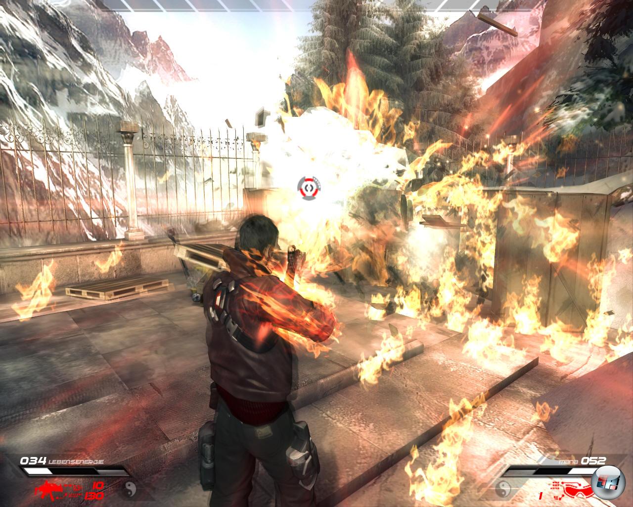 Doch warum übers Wasser fluchen, wenn das Schöne liegt so nah? Technisch ist Infernal beeindruckend, um nicht zu sagen höllisch gut: Toll animierte Figuren, gut designte Levels, fantastische Effekte – und das alles auch noch bei beeindruckender Geschwindigkeit! Nochmals brachialer werden die ohnehin rabiaten Explosionen und in alle Richtungen platzenden Kisten mit einer PhysX-Karte, aber auch ohne gibt’s fetzige Gefechte. Und ob mit oder ohne Physik-Booster, diverse Fehler sind für alle da: Die Ragdoll-Animationen lassen erledigte Widersacher gelegentlich wie Ausdruckstänzer verweilen, außerdem verhalten sich grundsätzlich sehr schwere Objekte (z.B. abgesprengte Teile einer massiven Decke) eher wie Papierblätter als wie zentnerschwere Betonklötze. Gelegentlich sehr schwache Texturen, etwas zu sehr leuchtende Figuren und gerade im Falle der Polygon-Frauen schlimm designte Gesichter mögen Technik-Freaks ebenfalls sauer aufstoßen. Deutsche Spieler müssen überdies mit einer Reihe von Schnitten leben: Es gibt praktisch kein Blut oder sonstige Splatter-Effekte, darüber hinaus lassen sich erschossene Feinde, Zivilisten oder Tiere nicht beballern. Normalerweise tummelt ihr euch von Atmosphärenklängen begleitet in den Labors, Fabriken oder Klostern. Doch sobald es an den Austausch von heißem Blei geht, dreht die Musik in ordentlich treibende, rockig schmetternde Riffs über – bei Bossfights wird’s gar pompös und chorlastig!